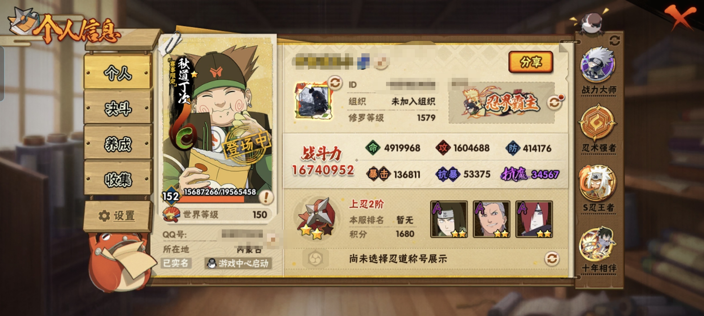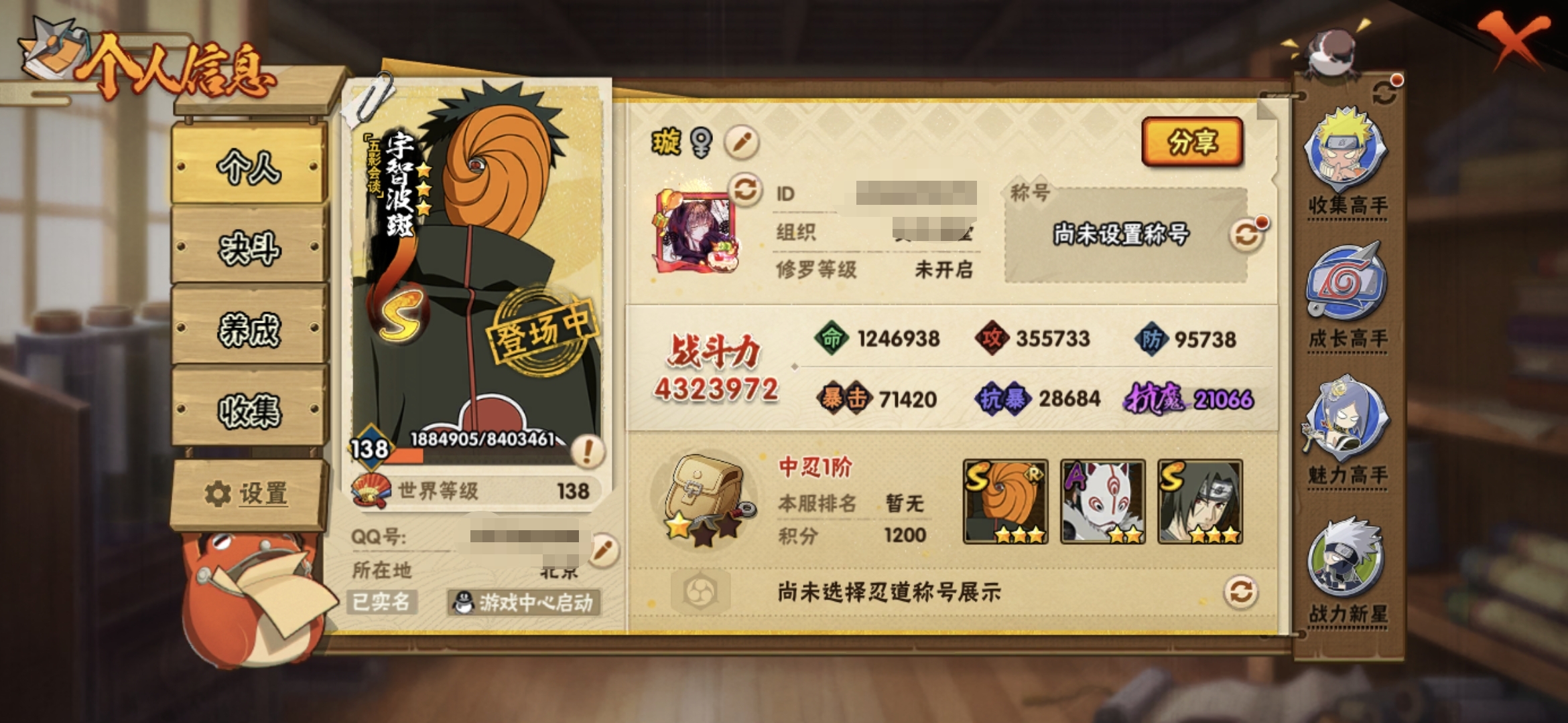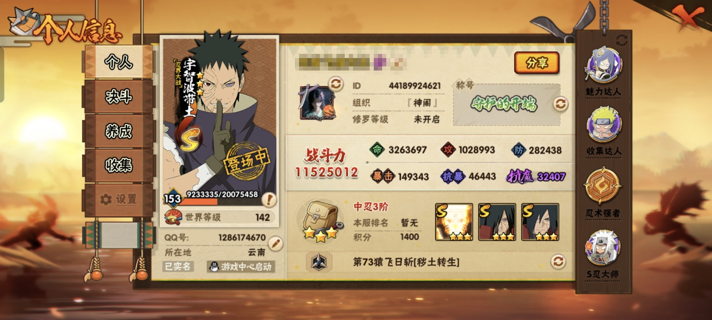 【火影忍者】【lyhy10713】战斗力:1680w;段位:暗部1阶;本服排名:126;vip:v13级;s忍:37个;a忍:51个;通灵兽:19个,s忍:秽土转生解宇智波斑|白面具宇智波斑|忍界大战宇智波带土|秽土转生千手扉间|超佩恩天道|天道佩恩 4星|传说中的三忍自来也|漩涡鸣人宇智波佐助|秽土转生千手柱间|木叶创立宇智波斑|秽土转生宇智波鼬|永恒万花筒宇智波佐助|忍界大战艾|舞之豪杰自来也|大蛇丸(普通) 4星|纲手(普通) 4星|百豪纲手|波风水门 4星|秽土转生波风水门|秽土转生宇智波斑|宇智波斑(普通)|须佐能乎宇智波鼬 4星|神秘面具男(普通)|秽土转生长门|秽土转生半藏|秽土转生金角银角|二代目土影无|三代目雷影艾|四代目风影罗砂|仙人模式药师兜|死门迈特凯|忍界大战大野木|九喇嘛连结漩涡鸣人|猿飞日斩(普通) 4星|秽土转生猿飞日斩|自来也(普通)|暴怒第六尾漩涡鸣人__a忍:青春爆炸迈特凯|仙人模式巳月|忍界大战日向宁次|四代目土影黑土|木叶上忍猿飞木叶丸 3星|青年长门|秽土转生迪达拉|宇智波止水(普通)|不风|忍界大战奇拉比|青年波风水门|青年艾|近松十人卫千代|半蛇斗篷药师兜|须佐能乎宇智波佐助|九尾查克拉漩涡鸣人 3星|暴怒宇智波带土|晓大蛇丸|百豪春野樱|忍界大战秋道丁次|忍界大战我爱罗|秽土转生猿飞阿斯玛|新春限定波风水门|夏日泳装小南|奇拉比(普通)|万花筒写轮眼宇智波佐助|五代目水影照美冥|五代目雷影达鲁伊|死司凭血飞段 4星|角都(普通)|疾风传我爱罗 4星|迪达拉(普通)|飞段(普通) 4星|小南(普通)|漂泊浪客小南|仙人模式漩涡鸣人 3星|万花筒写轮眼旗木卡卡西|迈特凯(普通) 5星|宇智波鼬(普通)|夏日限定宇智波鼬|干柿鬼鲛(普通) 5星|秽土转生桃地再不斩|桃地再不斩|蝎(普通) 5星|绯流琥蝎|猿飞阿斯玛(普通) 5星|桃式显现漩涡博人|六代目水影长十郎|宇智波泉奈|羁绊神农|初始形态机械鸣人__通灵兽:忍犬(普通)|蓝蛇|蛤蟆吉|忍龟|镰鼬|猿魔|山椒鱼|蜃|蛞蝓(普通)|蛤蟆仙人|鲛鲨|蛤蟆健|乌鸦(普通)|蛤蟆龙|砂之守鹤|蛤蟆广|梦貘|鹰|熊猫
