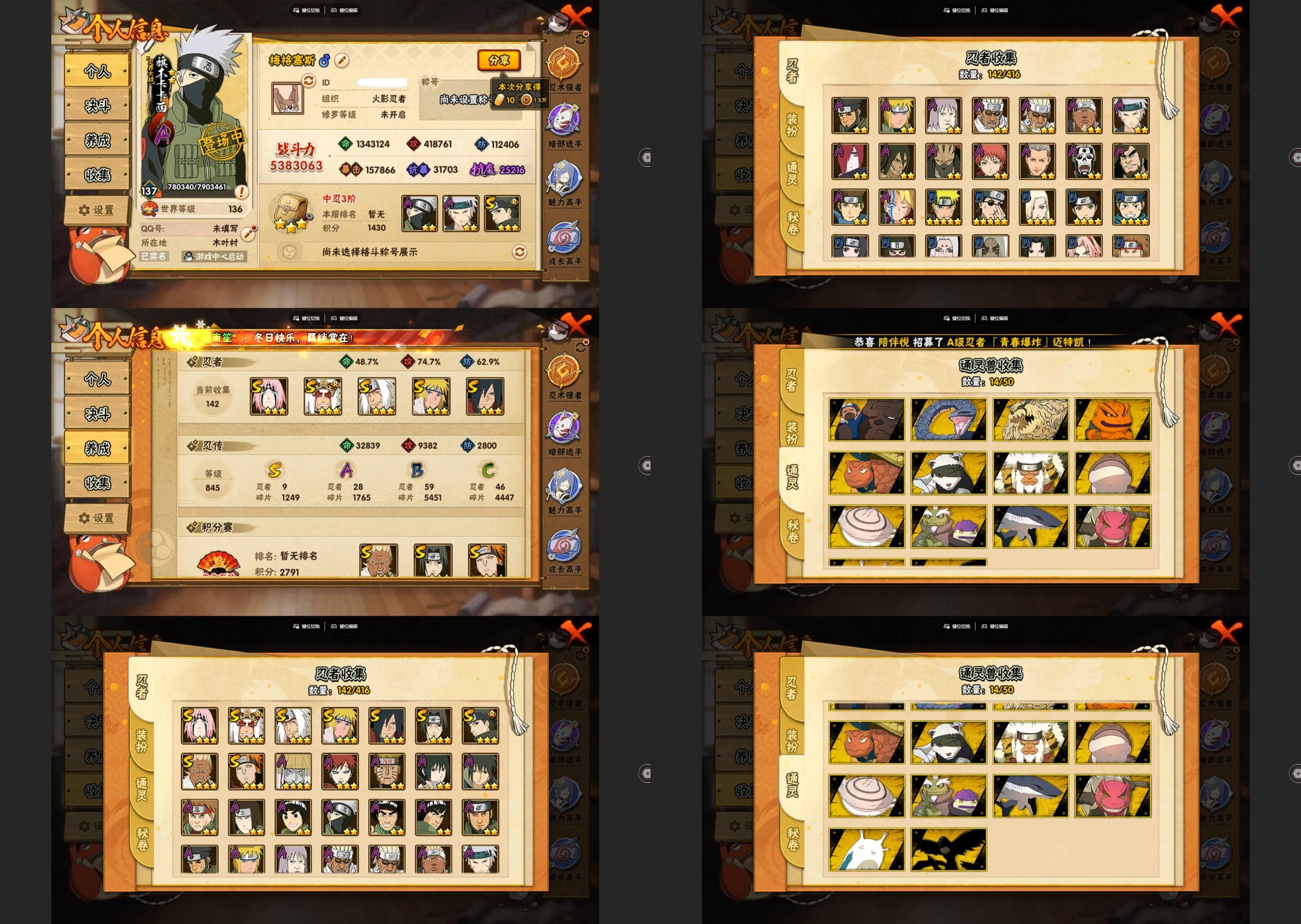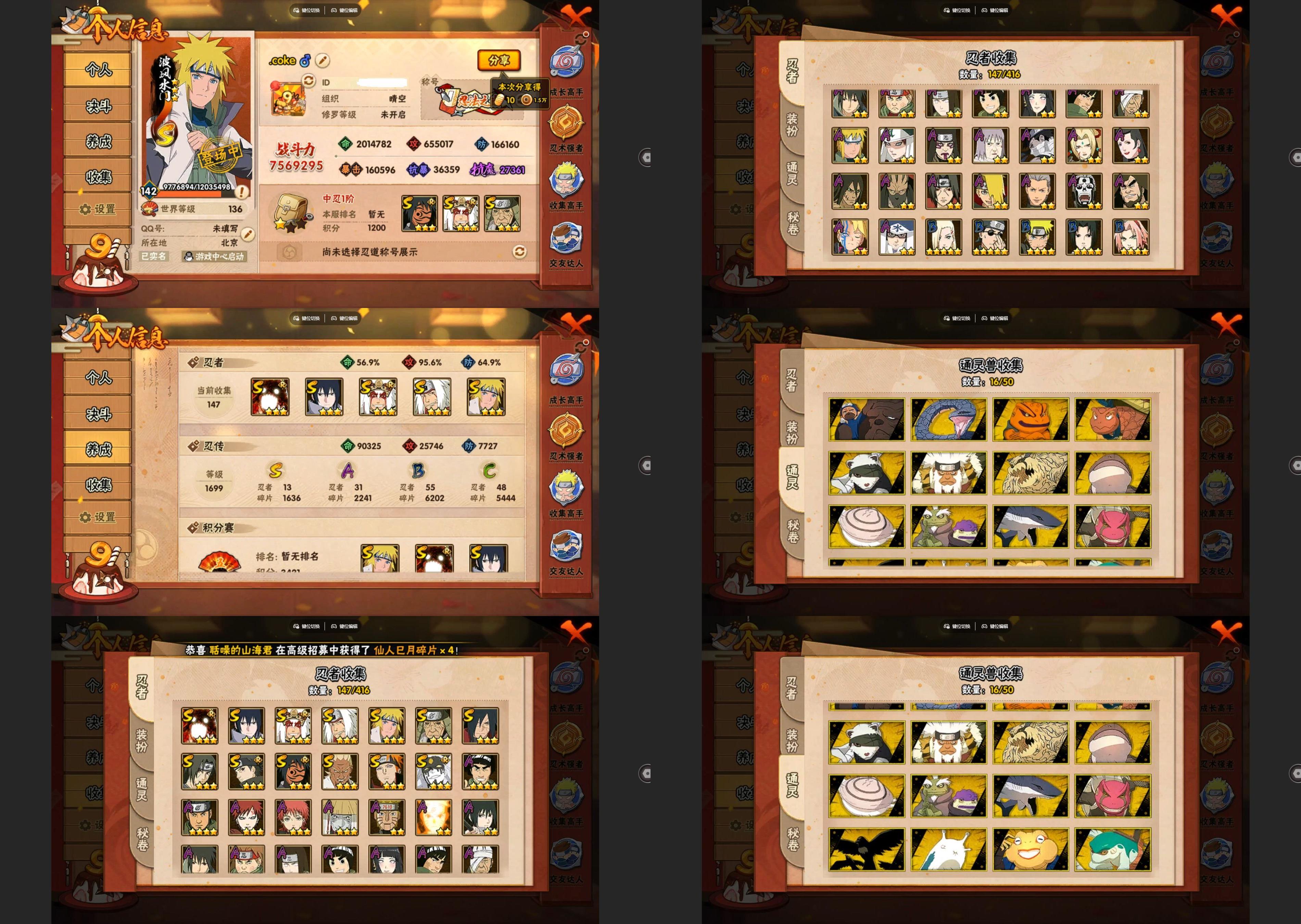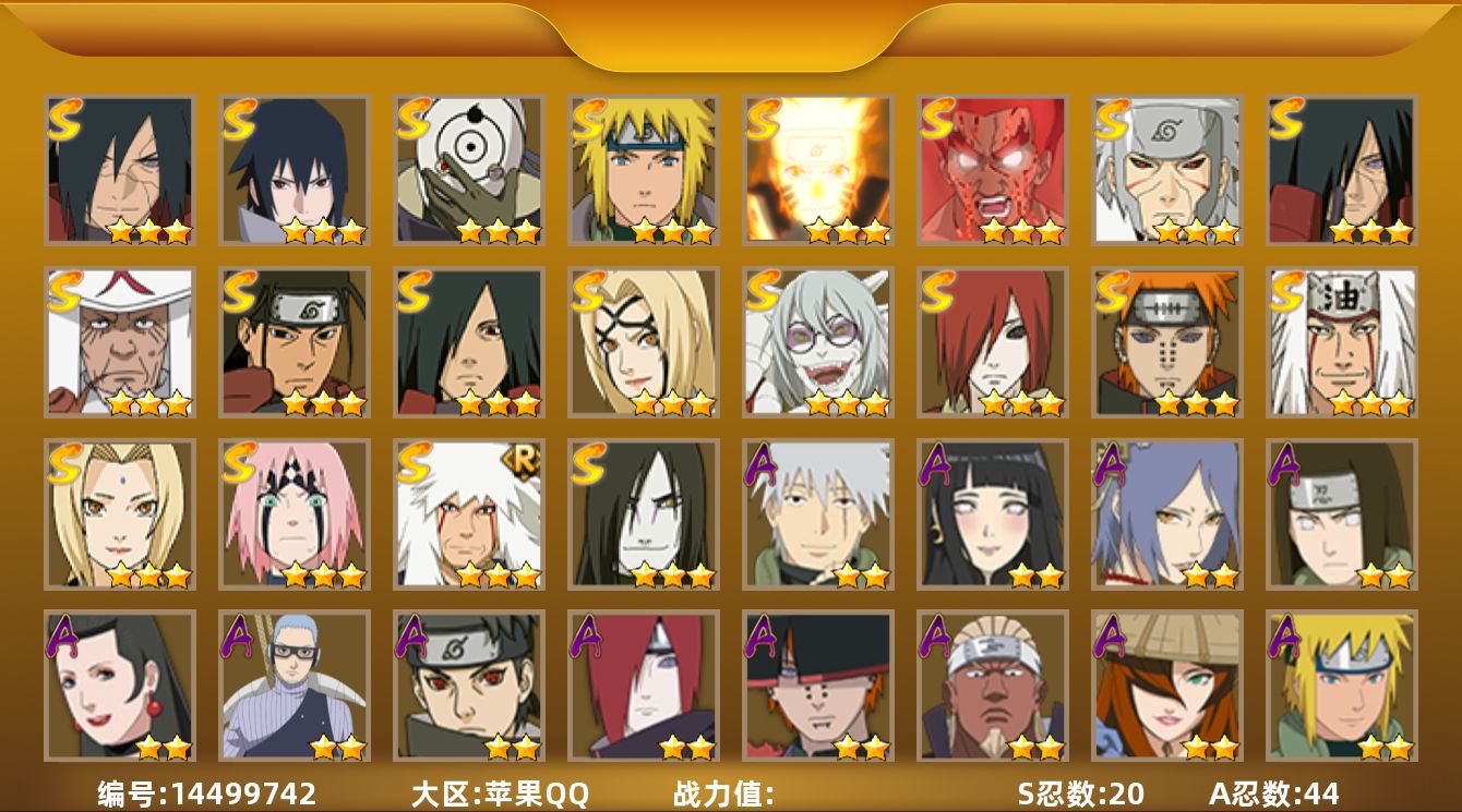 9s忍/28a忍/战力538w/v10/区服3116 【s忍者】 宇智波止水「须佐能乎」,艾「忍界大战」,宇智波斑「秽土转生·解」,春野樱「忍界大战」,自来也「舞之豪杰」,自来也「传说中的三忍」,宇智波鼬「须佐能乎」,佩恩「天道」,波风水门, 【a忍者】 日向宁次「忍界大战」,漩涡博人「桃式显现」,李洛克「忍界大战」,蝎「绯流琥」,宇智波泉奈,神农「羁绊」,角都「秽土转生」,长门「青年」,艾「青年