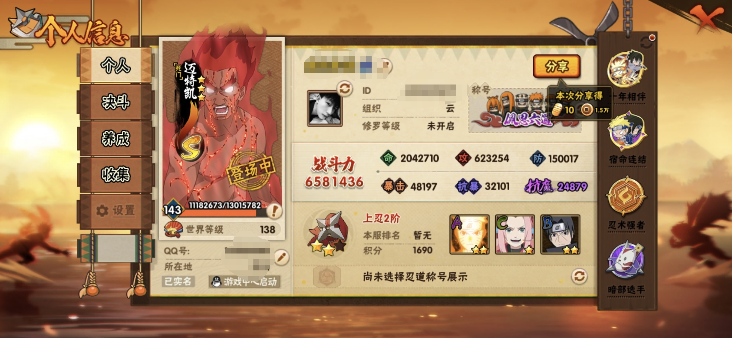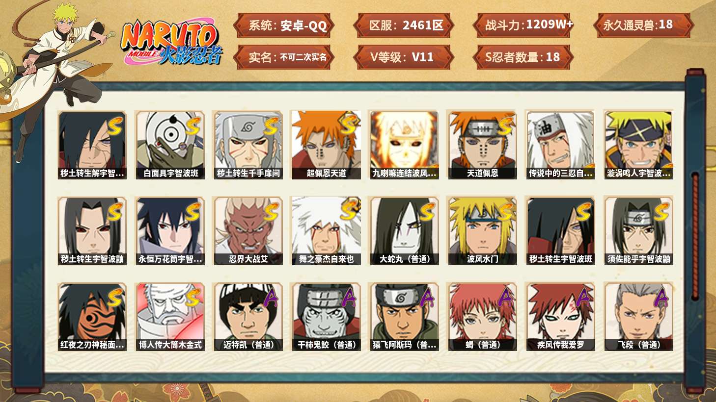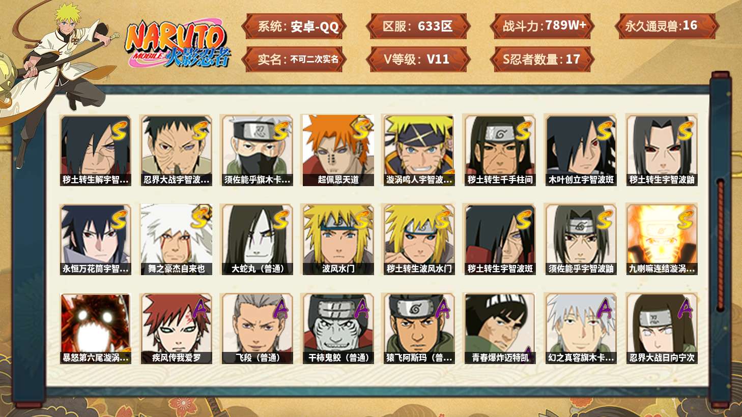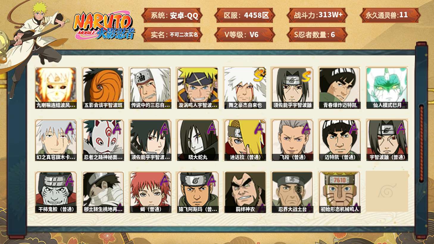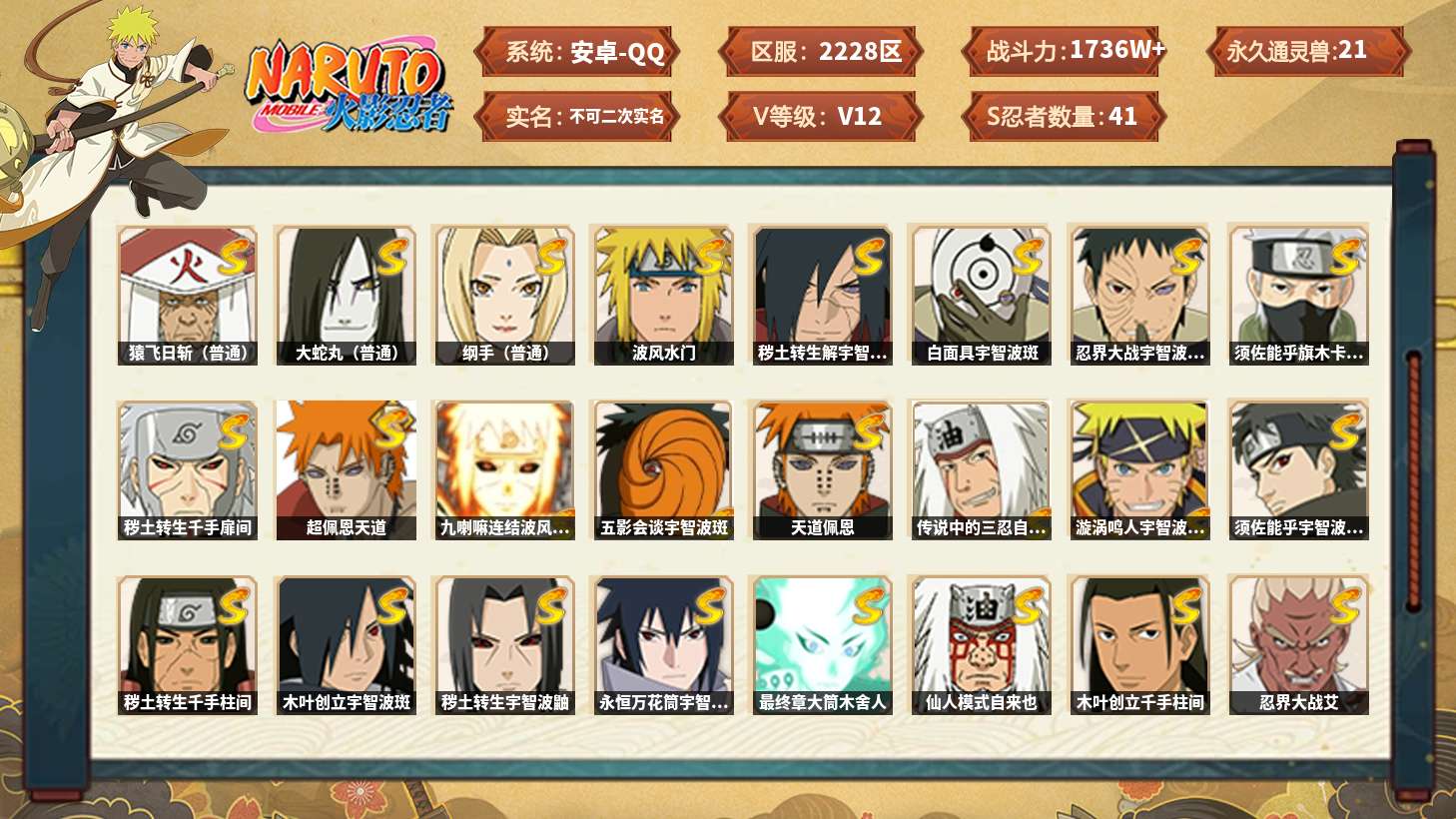 【s忍者10 a忍者26 通灵16】【安卓q-2269区-143级-v5-658万战力】【s级】自来也「舞之豪杰」 佩恩「天道」 波风水门 宇智波鼬「须佐能乎」 宇智波斑「秽土转生·解」 自来也「传说中的三忍」 旗木卡卡西「须佐能乎」 漩涡鸣人·宇智波佐助 迈特凯「死门」 大蛇丸【a级】猿飞阿斯玛 波风水门「青年」 日向宁次「忍界大战」 宇智波带土「暴怒」 蝎 漩涡博人「桃式显