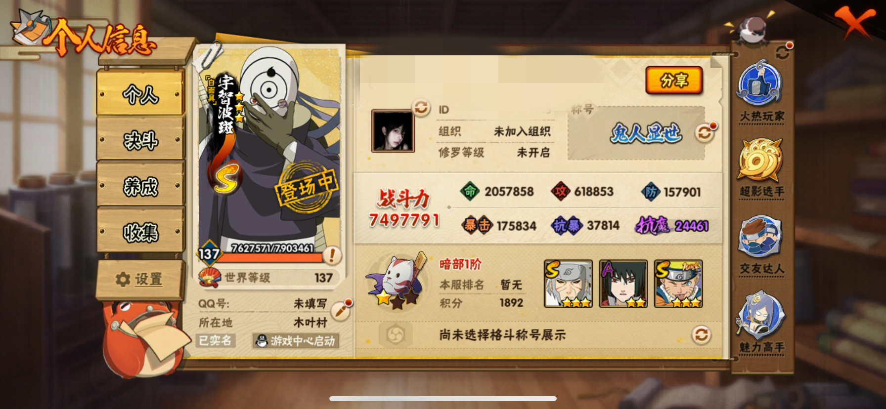【火影忍者】【lyhy10772】战斗力:789w;段位:上忍1阶;本服排名:879;vip:v11级;s忍:17个;a忍:26个;通灵兽:16个,s忍:秽土转生解宇智波斑|忍界大战宇智波带土|须佐能乎旗木卡卡西|超佩恩天道|漩涡鸣人宇智波佐助|秽土转生千手柱间|木叶创立宇智波斑|秽土转生宇智波鼬|永恒万花筒宇智波佐助|舞之豪杰自来也|大蛇丸(普通)|波风水门|秽土转生波风水门|秽土转生宇智波斑|须佐能乎宇智波鼬|九喇嘛连结漩涡鸣人|暴怒第六尾漩涡鸣人__a忍:青春爆炸迈特凯|幻之真容旗木卡卡西|忍界大战日向宁次|四代目土影黑土|忍者之路神秘面具男|秽土转生迪达拉|忍界大战奇拉比|青年波风水门|近松十人卫千代|须佐能乎宇智波佐助|九尾查克拉漩涡鸣人|忍界大战秋道丁次|忍界大战我爱罗|奇拉比(普通)|万花筒写轮眼宇智波佐助|五代目雷影达鲁伊|死司凭血飞段|疾风传我爱罗 3星|飞段(普通) 3星|迈特凯(普通)|干柿鬼鲛(普通) 3星|蝎(普通)|猿飞阿斯玛(普通) 3星|桃式显现漩涡博人|羁绊神农|初始形态机械鸣人__通灵兽:忍犬(普通)|蓝蛇|蛤蟆吉|忍龟|镰鼬|猿魔|山椒鱼|砂之守鹤|蜃|蛤蟆仙人|鲛鲨|蛤蟆健|乌鸦(普通)|蛞蝓(普通)|蛤蟆龙|蛤蟆广
