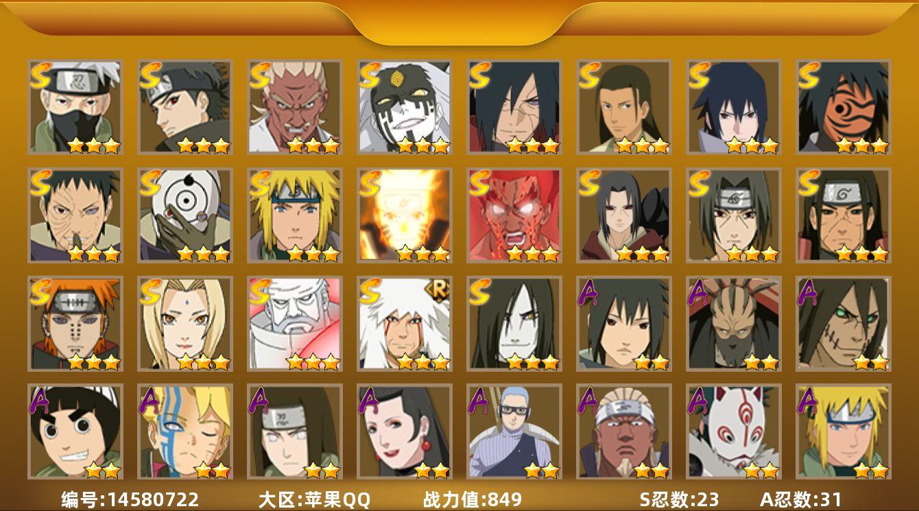 [14550313]v11 23s 44a 1285万战力 本服前100名 热门a忍有秽土阿斯玛、夏日卡卡西、新春水门、秽土再不斩、漂泊六道、新春鼬、漂泊带土、四代黑土等。碎片死门凯50片 金水门71片 桃式84片 yy1238 【s级忍者】:千手柱间「秽土转生」3星,宇智波斑「秽土转生·解」3星,大野木「忍界大战」3星,宇智波带土「忍界大战」3星,宇智波鼬「须佐能乎」4星,旗木卡卡西「须佐能乎」3星,宇智波斑「木叶创立」3星,千手柱间「木叶创立」3星,罗砂「四代目风影」3星,自来也3星,自来也「舞之豪杰」3星,大蛇丸3星,自来也「传说中的三忍」3星,纲手3星,猿飞日斩3星,波风水门3星,神秘面具男3星,漩涡鸣人「九喇嘛连结」3星,佩恩「天道」3星,宇智波佐助「永恒万花筒」3星,大筒木金式3星,大筒木舍人「最终章」3星,漩涡鸣人「暴怒·第六尾」3星 【a级忍者】:艾「青年」2星,长门「青年」2星,波风水门「青年」2星,波风水门「新春限定」2星,达鲁伊「博人传」2星,迪达拉2星,迪达拉「秽土转生」2星,奇拉比2星,奇拉比「忍界大战」2星,飞段3星,飞段「死司凭血」2星,干柿鬼鲛5星,漩涡博人「桃式显现」2星,漩涡鸣人「仙人模式」2星,漩涡鸣人「九尾查克拉」2星,迈特凯5星,旗木卡卡西「元气夏日」2星,桃地再不斩2星,桃地再不斩「秽土转生」2星,我爱罗「疾风传」3星,蝎4星,蝎「绯流琥」2星,小南2星,角都「秽土转生」2星,猿飞阿斯玛5星,猿飞阿斯玛「秽土转生」2星,宇智波止水2星,宇智波鼬2星,宇智波鼬「新春限定」2星,宇智波佐助「须佐能乎」2星,宇智波佐助「万花筒写轮眼」2星,照美冥「五代目水影」2星,日向宁次「忍界大战」2星,宇智波带土「漂泊浪客」2星,长十郎「六代目水影」2星,佩恩·六道「漂泊浪客」2星,李洛克「忍界大战」2星,黑土「博人传」2星,秋道丁次「忍界大战」2星,千代「近松十人卫」2星,神农「羁绊」2星,志村团藏2星,加藤断2星,宇智波泉奈2星