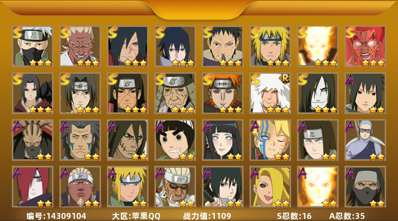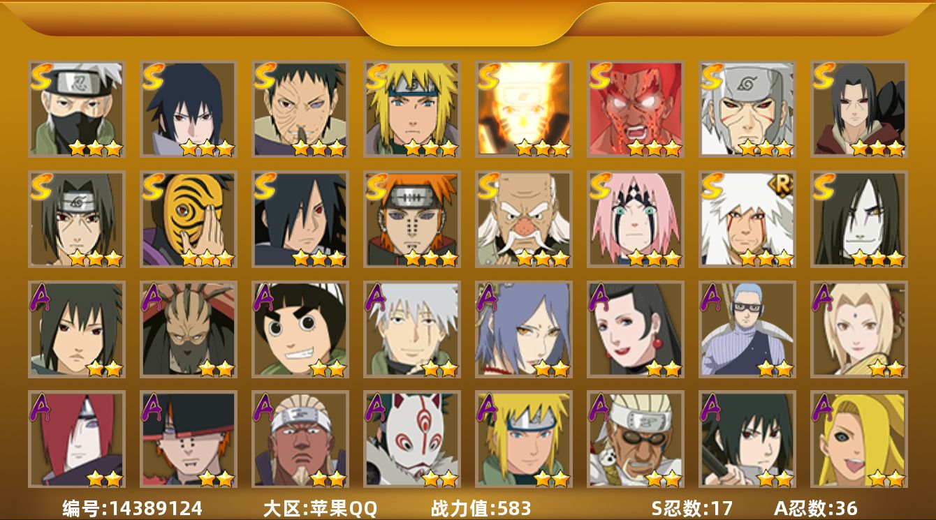 [14389124]v11583w战力,17s级忍者数-36a级忍者数,金水门97片,红夜面具男50片。me1836 【s级忍者】:千手扉间「秽土转生」3星,宇智波鼬「秽土转生」3星,大野木「忍界大战」3星,春野樱「忍界大战」3星,宇智波带土「忍界大战」3星,宇智波鼬「须佐能乎」3星,旗木卡卡西「须佐能乎」3星,宇智波斑「木叶创立」3星,自来也「舞之豪杰」3星,大蛇丸3星,自来也「传说中的三忍」3星,波风水门3星,神秘面具男3星,漩涡鸣人「九喇嘛连结」3星,迈特凯「死门」3星,佩恩「天道」3星,宇智波佐助「永恒万花筒」3星 【a级忍者】:艾「青年」2星,长门「青年」2星,波风水门「青年」2星,达鲁伊「博人传」2星,迪达拉2星,迪达拉「秽土转生」2星,大蛇丸「晓」2星,奇拉比2星,奇拉比「忍界大战」2星,飞段3星,飞段「死司凭血」2星,干柿鬼鲛3星,干柿鬼鲛「鲛肌融合」2星,迈特凯4星,旗木卡卡西「幻之真容」2星,我爱罗「疾风传」3星,蝎2星,蝎「绯流琥」2星,小南「漂泊浪客」2星,猿飞阿斯玛3星,猿飞阿斯玛「秽土转生」2星,宇智波鼬2星,宇智波佐助「须佐能乎」2星,宇智波佐助「疾风传咒印」2星,宇智波带土「漂泊浪客」2星,长十郎「六代目水影」2星,纲手「侠隐江湖」2星,神秘面具男「忍者之路」2星,佩恩·六道「漂泊浪客」2星,李洛克「忍界大战」2星,黑土「博人传」2星,春野樱「百豪」2星,秋道丁次「忍界大战」2星,千代「近松十人卫」2星,不缘2星,宇智波泉奈2星