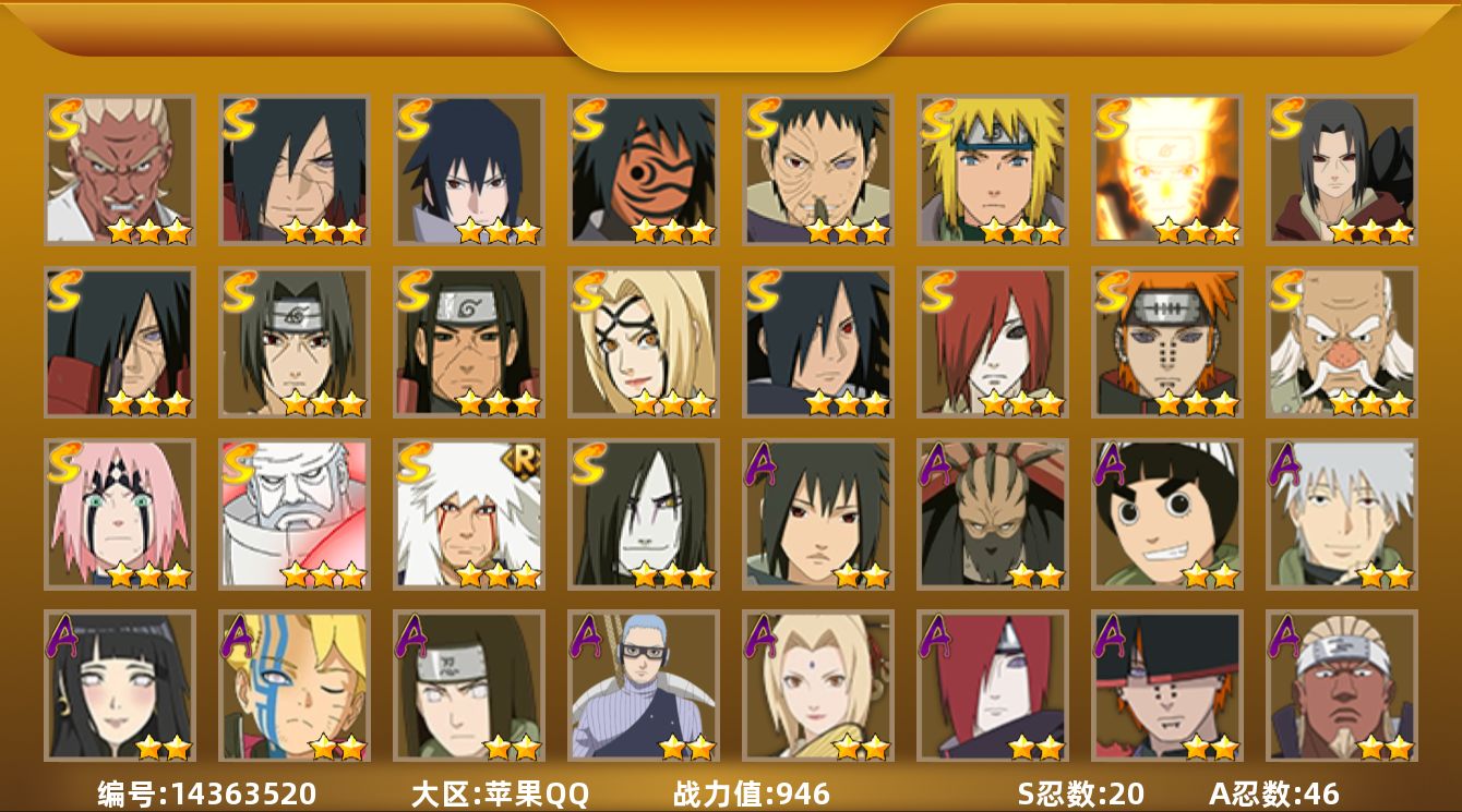 [14363520]v11 946万战力 20s-46a 有熊猫 九喇嘛水门50片 ll5426 【s级忍者】:长门「秽土转生」3星,千手柱间「秽土转生」3星,宇智波鼬「秽土转生」3星,宇智波斑「秽土转生」3星,宇智波斑「秽土转生·解」3星,大野木「忍界大战」3星,春野樱「忍界大战」3星,宇智波带土「忍界大战」3星,艾「忍界大战」3星,宇智波鼬「须佐能乎」3星,宇智波斑「木叶创立」3星,自来也「舞之豪杰」3星,大蛇丸3星,纲手「百豪」3星,波风水门3星,神秘面具男「红夜之刃」3星,漩涡鸣人「九喇嘛连结」3星,佩恩「天道」3星,宇智波佐助「永恒万花筒」3星,大筒木金式3星 【a级忍者】:艾「青年」2星,长门「青年」2星,波风水门「青年」2星,波风水门「新春限定」2星,达鲁伊「博人传」2星,迪达拉2星,迪达拉「秽土转生」2星,大蛇丸「晓」2星,奇拉比「忍界大战」2星,飞段3星,飞段「死司凭血」2星,干柿鬼鲛5星,漩涡博人「桃式显现」2星,漩涡鸣人「仙人模式」2星,漩涡鸣人「九尾查克拉」2星,机械鸣人「初始形态」2星,迈特凯5星,旗木卡卡西「忍界大战」2星,旗木卡卡西「幻之真容」2星,桃地再不斩「漂泊武士」2星,桃地再不斩「秽土转生」2星,我爱罗「疾风传」4星,我爱罗「忍界大战」2星,蝎2星,蝎「绯流琥」2星,猿飞阿斯玛5星,宇智波鼬3星,宇智波佐助「须佐能乎」2星,宇智波佐助「万花筒写轮眼」2星,药师兜「半蛇斗篷」2星,照美冥「五代目水影」2星,日向宁次「忍界大战」2星,日向雏田「最终章」2星,长十郎「六代目水影」3星,纲手「侠隐江湖」2星,神秘面具男「忍者之路」2星,佩恩·六道「漂泊浪客」2星,李洛克「忍界大战」2星,黑土「博人传」2星,春野樱「百豪」2星,秋道丁次「忍界大战」2星,千代「近松十人卫」2星,神农「羁绊」2星,土台「忍界大战」2星,宇智波泉奈2星,大野木「侠隐江湖」2星