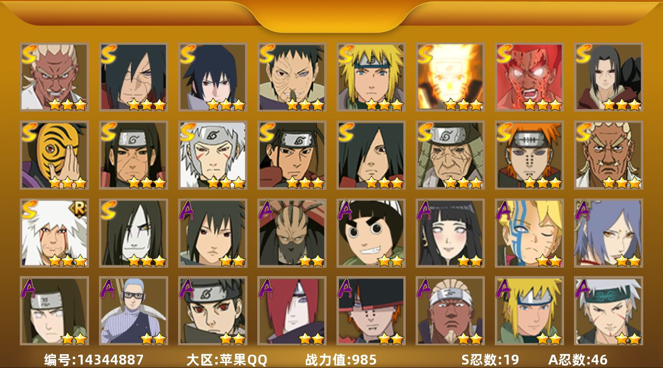[14344887]v11,19s,46a,985万战力,热门a忍忍战卡卡西、忍战我爱罗、漂泊再不斩、漂泊扉间、漂泊六道、漂泊小南、新春鼬等,须佐卡卡西42片,自来也76片,日斩70片,传说自来也88片,纲手94片,长门44片,yy1519 【s级忍者】:猿飞日斩「秽土转生」3星,千手柱间「秽土转生」3星,宇智波鼬「秽土转生」3星,宇智波斑「秽土转生·解」3星,宇智波带土「忍界大战」3星,艾「忍界大战」3星,宇智波鼬「须佐能乎」4星,艾「四代目雷影」3星,自来也「舞之豪杰」3星,大蛇丸4星,千手柱间3星,千手扉间3星,宇智波斑3星,波风水门3星,神秘面具男3星,漩涡鸣人「九喇嘛连结」3星,迈特凯「死门」3星,佩恩「天道」3星,宇智波佐助「永恒万花筒」3星 【a级忍者】:艾「青年」2星,长门「青年」2星,波风水门「青年」2星,达鲁伊「博人传」2星,迪达拉2星,迪达拉「秽土转生」2星,大蛇丸「晓」2星,奇拉比2星,奇拉比「忍界大战」2星,飞段4星,飞段「死司凭血」3星,干柿鬼鲛5星,漩涡博人「桃式显现」2星,漩涡鸣人「仙人模式」3星,迈特凯5星,旗木卡卡西「忍界大战」2星,旗木卡卡西「万花筒写轮眼」2星,桃地再不斩「漂泊武士」2星,我爱罗「疾风传」4星,我爱罗「忍界大战」2星,蝎5星,蝎「绯流琥」2星,小南2星,小南「漂泊浪客」2星,角都「地怨虞」2星,猿飞阿斯玛5星,宇智波止水2星,猿飞日斩「火影继承人」2星,宇智波鼬2星,宇智波鼬「新春限定」2星,宇智波佐助「须佐能乎」2星,宇智波佐助「万花筒写轮眼」2星,照美冥「五代目水影」2星,日向宁次「忍界大战」2星,日向雏田「最终章」2星,长十郎「六代目水影」2星,佩恩·六道「漂泊浪客」2星,李洛克「忍界大战」2星,黑土「博人传」2星,千手扉间「漂泊武士」2星,勘九郎「忍界大战」2星,春野樱「百豪」2星,秋道丁次「忍界大战」2星,千代「近松十人卫」2星,志村团藏2星,宇智波泉奈2星 【永久主场景】:木叶周年庆,博人传
