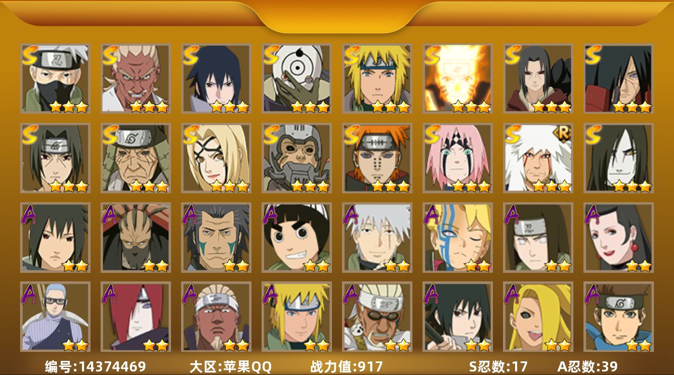 [14374469]v9 917万战力 17s-39a 日斩55片 秽土解斑72片 ll5421 【s级忍者】:半藏「秽土转生」3星,猿飞日斩「秽土转生」3星,宇智波鼬「秽土转生」3星,宇智波斑「秽土转生」3星,春野樱「忍界大战」3星,艾「忍界大战」3星,宇智波鼬「须佐能乎」3星,旗木卡卡西「须佐能乎」3星,自来也「舞之豪杰」3星,大蛇丸3星,自来也「传说中的三忍」3星,纲手「百豪」3星,波风水门3星,漩涡鸣人「九喇嘛连结」3星,佩恩「天道」3星,宇智波佐助「永恒万花筒」3星,宇智波斑 「白面具」3星宇智波斑「白面具」 【a级忍者】:艾「青年」2星,长门「青年」2星,波风水门「青年」2星,迪达拉2星,迪达拉「秽土转生」2星,大蛇丸「晓」2星,奇拉比「忍界大战」2星,飞段3星,飞段「死司凭血」2星,干柿鬼鲛5星,漩涡博人「桃式显现」2星,漩涡鸣人「仙人模式」2星,漩涡鸣人「九尾查克拉」2星,迈特凯5星,旗木卡卡西「幻之真容」2星,桃地再不斩2星,我爱罗「疾风传」4星,我爱罗「忍界大战」2星,蝎5星,蝎「绯流琥」2星,角都2星,猿飞阿斯玛5星,宇智波鼬2星,宇智波鼬「新春限定」2星,宇智波佐助「须佐能乎」2星,宇智波佐助「疾风传咒印」2星,宇智波佐助「万花筒写轮眼」2星,药师兜「半蛇斗篷」2星,照美冥「五代目水影」2星,日向宁次「忍界大战」2星,长十郎「六代目水影」2星,李洛克「忍界大战」2星,猿飞木叶丸「博人传」2星,黑土「博人传」2星,秋道丁次「忍界大战」2星,千代「近松十人卫」2星,不缘2星,宇智波泉奈2星,不动2星