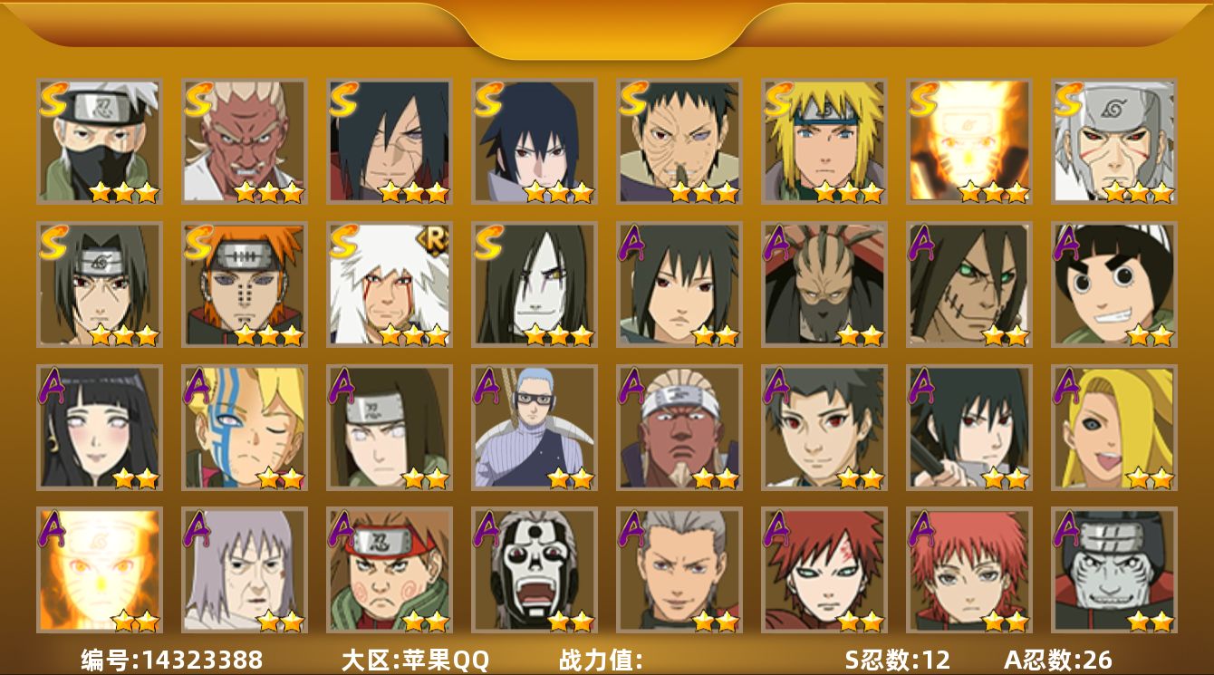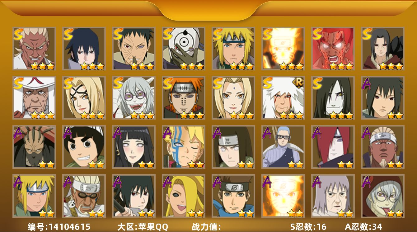 [14104615]v9 880战力 16s级忍者数-34a级忍者数cc8227 【s级忍者】:宇智波鼬「秽土转生」3星,宇智波带土「忍界大战」3星,艾「忍界大战」3星,宇智波鼬「须佐能乎」4星,自来也「舞之豪杰」3星,大蛇丸3星,纲手3星,纲手「百豪」3星,猿飞日斩3星,波风水门3星,药师兜「仙人模式」3星,漩涡鸣人「九喇嘛连结」3星,迈特凯「死门」3星,佩恩「天道」3星,宇智波佐助「永恒万花筒」3星,宇智波斑 「白面具」3星宇智波斑「白面具」 【a级忍者】:艾「青年」2星,长门「青年」2星,波风水门「青年」2星,达鲁伊「博人传」2星,迪达拉2星,迪达拉「秽土转生」2星,奇拉比2星,奇拉比「忍界大战」2星,飞段4星,飞段「死司凭血」2星,干柿鬼鲛5星,漩涡博人「桃式显现」2星,漩涡鸣人「仙人模式」2星,漩涡鸣人「九尾查克拉」2星,迈特凯5星,我爱罗「疾风传」4星,蝎4星,蝎「绯流琥」2星,猿飞阿斯玛4星,宇智波鼬2星,宇智波佐助「须佐能乎」2星,宇智波佐助「万花筒写轮眼」2星,药师兜「半蛇斗篷」2星,照美冥「五代目水影」2星,日向宁次「忍界大战」2星,日向雏田「最终章」2星,长十郎「六代目水影」2星,李洛克「忍界大战」2星,猿飞木叶丸「博人传」2星,黑土「博人传」2星,春野樱「百豪」2星,秋道丁次「忍界大战」2星,千代「近松十人卫」2星,宇智波泉奈2星