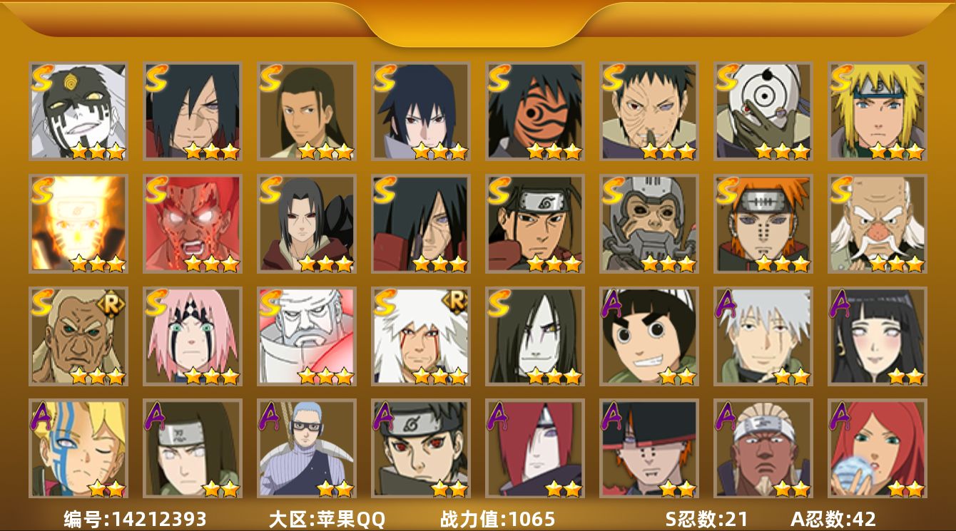 [14212393]v11 21s忍 42a忍 战力1065万 有1.6万金币 须佐止水55片 忍战艾53片 ll3717 【s级忍者】:半藏「秽土转生」3星,宇智波鼬「秽土转生」3星,宇智波斑「秽土转生」3星,宇智波斑「秽土转生·解」3星,大野木「忍界大战」3星,春野樱「忍界大战」3星,宇智波带土「忍界大战」3星,千手柱间「木叶创立」3星,艾「三代目雷影」3星,自来也「舞之豪杰」3星,大蛇丸3星,千手柱间3星,波风水门3星,神秘面具男「红夜之刃」3星,漩涡鸣人「九喇嘛连结」3星,迈特凯「死门」3星,佩恩「天道」3星,宇智波佐助「永恒万花筒」3星,宇智波斑 「白面具」3星宇智波斑「白面具」,大筒木金式3星,大筒木桃式3星 【a级忍者】:艾「青年」2星,长门「青年」2星,波风水门「青年」2星,达鲁伊「博人传」2星,迪达拉2星,迪达拉「秽土转生」2星,大蛇丸「晓」2星,奇拉比2星,奇拉比「忍界大战」2星,飞段2星,飞段「死司凭血」3星,干柿鬼鲛5星,漩涡博人「桃式显现」2星,漩涡鸣人「仙人模式」2星,迈特凯5星,旗木卡卡西「幻之真容」2星,桃地再不斩「漂泊武士」2星,我爱罗「疾风传」4星,我爱罗「忍界大战」2星,蝎4星,角都「地怨虞」2星,角都「晓创生」2星,猿飞阿斯玛5星,宇智波止水2星,宇智波鼬2星,宇智波佐助「须佐能乎」2星,宇智波佐助「万花筒写轮眼」2星,照美冥「五代目水影」2星,日向宁次「忍界大战」2星,日向雏田「最终章」2星,绝2星,长十郎「六代目水影」2星,佩恩·六道「漂泊浪客」2星,李洛克「忍界大战」2星,猿飞木叶丸「博人传」2星,黑土「博人传」2星,勘九郎「忍界大战」2星,秋道丁次「忍界大战」2星,千代「近松十人卫」2星,不风2星,加藤断2星,地陆2星暑假末清仓