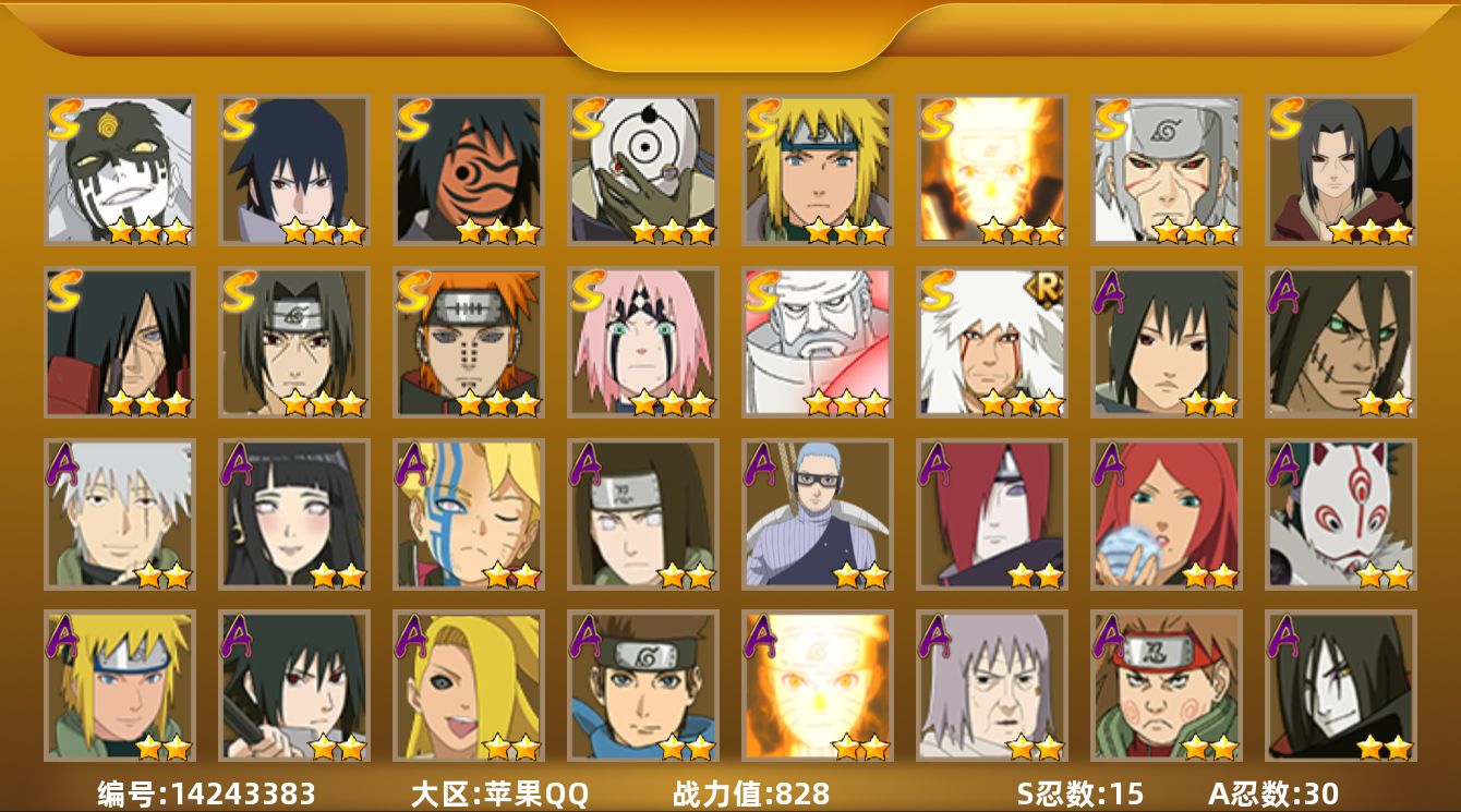 [14243383]v10 15s 30a 828万战力 传说自来也50片 秽土解斑92片 三代目雷影60片 最终张舍人67片 zp3059 【s级忍者】:千手扉间「秽土转生」3星,宇智波鼬「秽土转生」3星,宇智波斑「秽土转生」3星,春野樱「忍界大战」3星,宇智波鼬「须佐能乎」3星,自来也「舞之豪杰」3星,波风水门3星,神秘面具男「红夜之刃」3星,漩涡鸣人「九喇嘛连结」3星,佩恩「天道」3星,宇智波佐助「永恒万花筒」3星,宇智波斑 「白面具」3星宇智波斑「白面具」,大筒木金式3星,大筒木桃式3星,漩涡鸣人「暴怒·第六尾」3星 【a级忍者】:长门「青年」2星,波风水门「青年」2星,迪达拉「秽土转生」2星,大蛇丸「晓」2星,奇拉比2星,飞段3星,飞段「死司凭血」3星,干柿鬼鲛5星,漩涡博人「桃式显现」2星,漩涡鸣人「九尾查克拉」2星,迈特凯5星,旗木卡卡西「幻之真容」2星,桃地再不斩「秽土转生」2星,我爱罗「疾风传」3星,蝎3星,角都「秽土转生」2星,猿飞阿斯玛5星,宇智波鼬2星,宇智波佐助「须佐能乎」2星,日向宁次「忍界大战」2星,日向雏田「最终章」2星,长十郎「六代目水影」2星,神秘面具男「忍者之路」2星,猿飞木叶丸「博人传」2星,黑土「博人传」2星,秋道丁次「忍界大战」2星,千代「近松十人卫」2星,神农「羁绊」2星,不风2星,宇智波泉奈2星