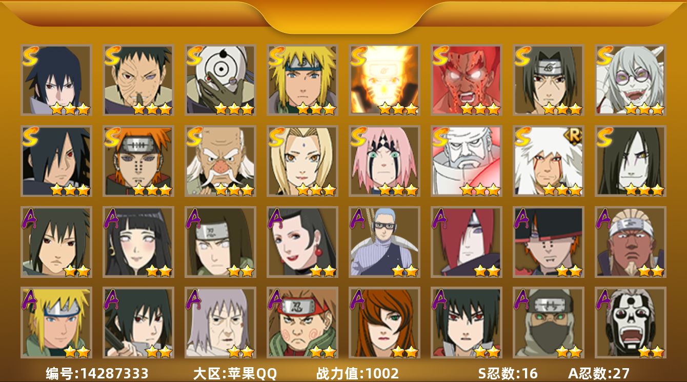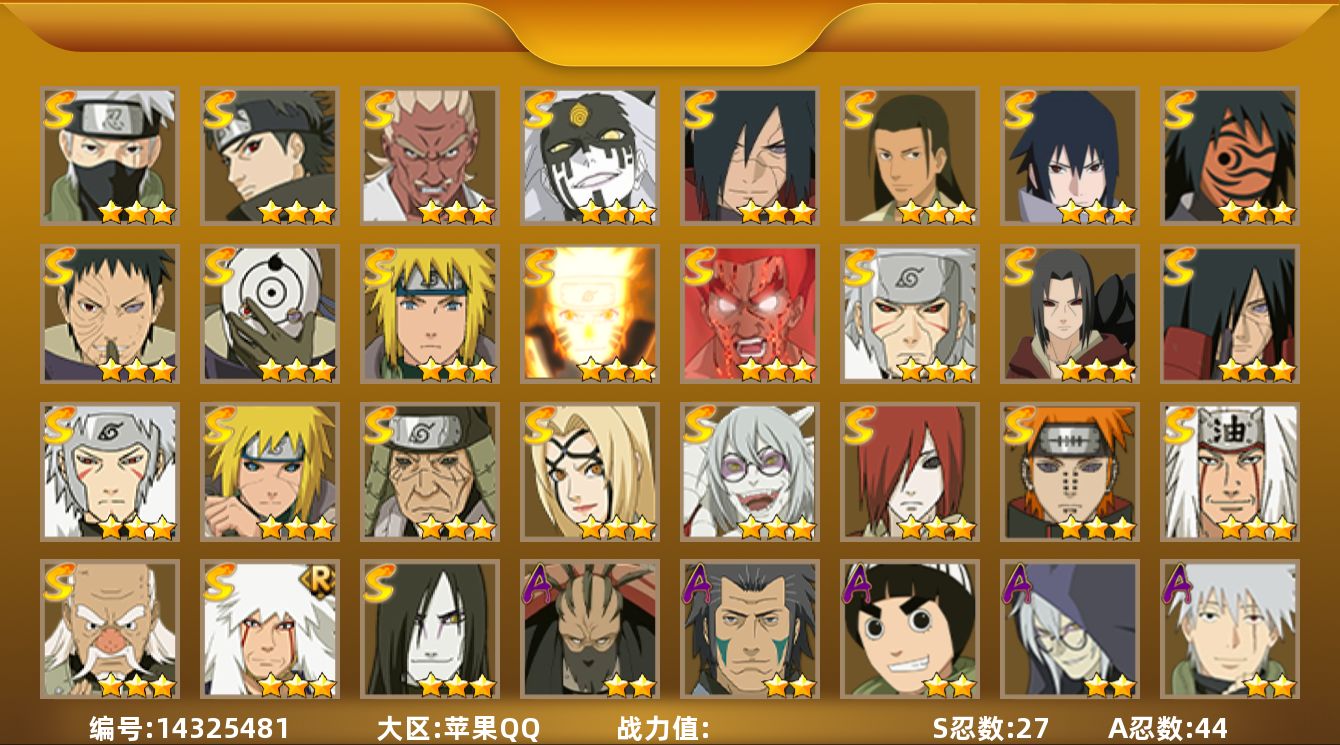[14287333]v10 16s 27a 1002万战力 有熊猫 须佐卡卡西94片 秽土日斩52片 日斩73片 zp3065 脱榜需要稳定设备 【s级忍者】:大野木「忍界大战」3星,春野樱「忍界大战」3星,宇智波带土「忍界大战」3星,宇智波鼬「须佐能乎」3星,宇智波斑「木叶创立」3星,自来也「舞之豪杰」3星,大蛇丸3星,纲手3星,波风水门3星,药师兜「仙人模式」3星,漩涡鸣人「九喇嘛连结」3星,迈特凯「死门」3星,佩恩「天道」3星,宇智波佐助「永恒万花筒」3星,宇智波斑 「白面具」3星宇智波斑「白面具」,大筒木金式3星 【a级忍者】:艾「青年」2星,长门「青年」2星,波风水门「青年」2星,达鲁伊「博人传」2星,迪达拉2星,飞段2星,飞段「死司凭血」2星,干柿鬼鲛5星,迈特凯5星,我爱罗「疾风传」3星,蝎4星,角都2星,角都「地怨虞」2星,猿飞阿斯玛5星,宇智波鼬2星,宇智波佐助「须佐能乎」2星,宇智波佐助「万花筒写轮眼」2星,照美冥「五代目水影」2星,日向宁次「忍界大战」2星,日向雏田「最终章」2星,长十郎「六代目水影」2星,佩恩·六道「漂泊浪客」2星,黑土「博人传」2星,秋道丁次「忍界大战」2星,千代「近松十人卫」2星,不缘2星,宇智波泉奈2星