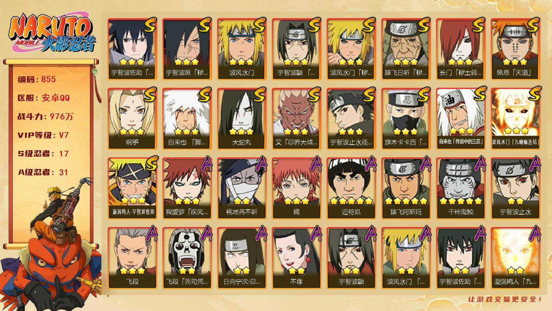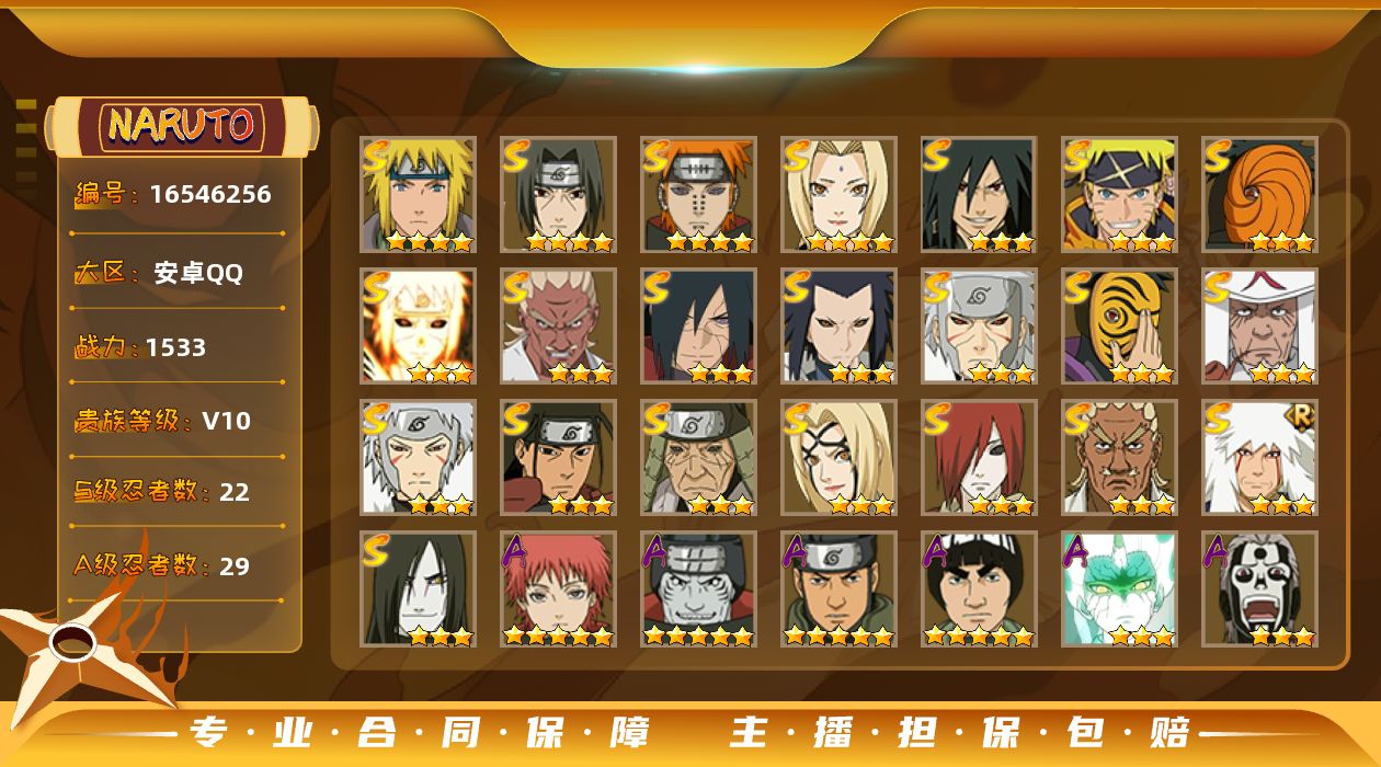 v10 7s忍 20a忍 16通灵 500.6w战力 可二次 可修改实名 【s级忍者】自来也 「舞之豪杰」漩涡鸣人 「暴怒·第六尾」波风水门「九喇嘛连结」宇智波斑「五影会谈」漩涡鸣人·宇智波佐助神秘面具男宇智波鼬 「须佐能乎」 【通灵兽】熊猫
