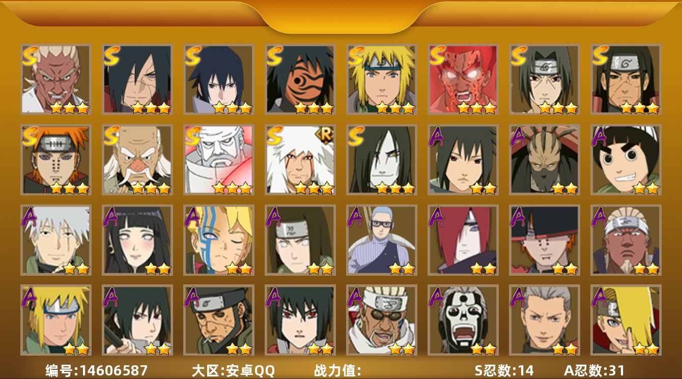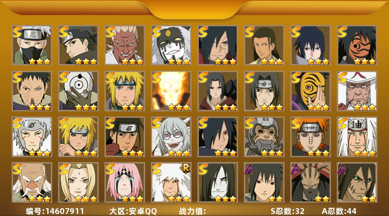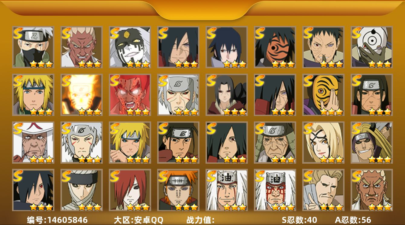 [5709487]可二次修改-安卓q区 145级 1056万战斗力 v10 156忍者 17名s忍 九喇嘛鸣人 忍战樱 万花筒佐助 豪杰自来也 大蛇丸 纲手 八门凯 波风水门 秽土柱间 木叶创立柱间 秽土斑 木叶创立斑 忍战带土 红夜面具男 忍战大野木 天道佩恩 大筒木金式(猿飞日斩90碎片 秽土斑解89碎片) 28名a忍 59名b忍 52名c忍
