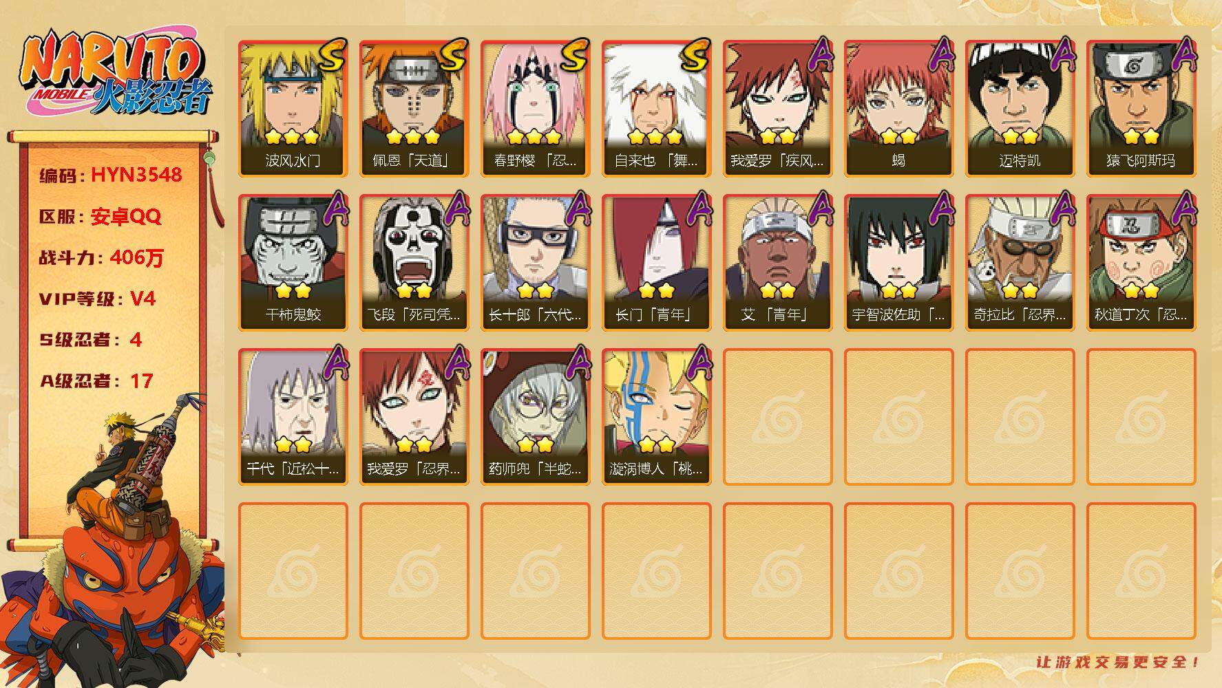 【hyn3548】v4/战力406w/s忍4/a忍17/通灵兽12/3星自来也「舞之豪杰」/2星我爱罗「疾风传」/2星飞段「死司凭血」/2星长门「青年」/2星迈特凯/2星蝎/2星药师兜「半蛇斗篷」/3星佩恩「天道」/2星猿飞阿斯玛/3星春野樱「忍界大战」/3星波风水门/2星宇智波佐助「万花筒写轮眼」/2星宇智波泉奈/2星我爱罗「忍界大战」/2星秋道丁次「忍界大战」/2星干柿鬼鲛/2星漩涡博人「桃式显现」/2星艾「青年」/2星奇拉比「忍界大战」/2星千代「近松十人卫」/2星长十郎「六代目水影」