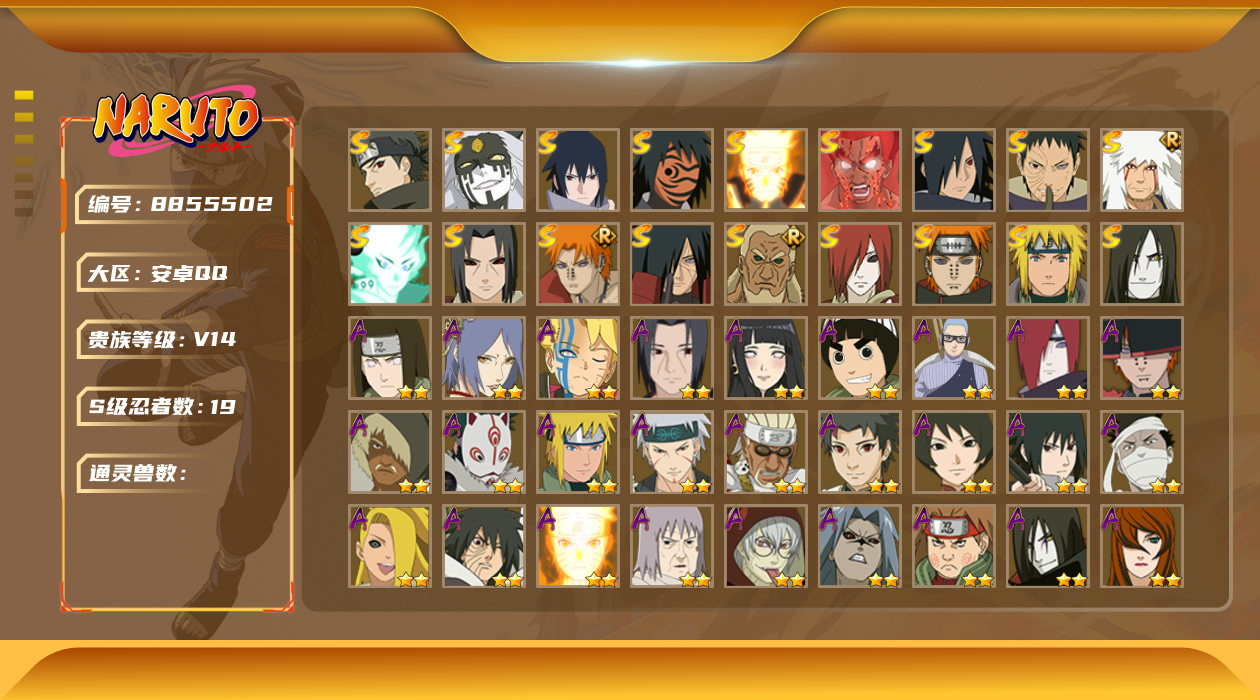 [8855536]x9527战斗力:1052w;段位:上忍3阶;本服排名:611;战区排名:未上榜;vip13级;s忍28个;a忍43个;通灵兽19个;s忍:忍界大战宇智波带土二代目水影鬼灯幻月须佐能乎宇智波止水自来也(普通)纲手(普通)永恒万花筒宇智波佐助白面具宇智波斑死门迈特凯博人传大筒木金式神秘面具男(普通)千手柱间(普通)天道佩恩波风水门(普通)秽土转生宇智波斑秽土转生解宇智波斑大蛇丸(普通)舞之豪杰自来也木叶创立千手柱间红夜之刃神秘面具男九喇嘛连结漩涡鸣人宇智波斑(普通)须佐能乎旗木卡卡西秽土转生宇智波鼬大筒木桃式须佐能乎宇智波鼬秽土转生千手柱间仙人模式药师兜秽土转生长门;a忍:5星迈特凯(普通)5星猿飞阿斯玛(普通)5星干柿鬼鲛(普通)4星疾风传我爱罗3星蝎(普通)3星飞段(普通)忍者之路神秘面具男仙人模式漩涡鸣人万花筒写轮眼宇智波佐助须佐能乎宇智波佐助宇智波泉奈忍界大战秋道丁次忍界大战李洛克最终章日向雏田万花筒写轮眼旗木卡卡西忍界大战旗木卡卡西宇智波止水(普通)新春限定波风水门青年波风水门近松十人卫千代侠隐江湖照美冥五代目水影照美冥漂泊武士桃地再不斩奇拉比(普通)漂泊武士千手扉间不缘不动青年长门漂泊浪客佩恩六道小南(普通)秽土转生角都晓大蛇丸绯流琥蝎晓创生蝎宇智波鼬(普通)迪达拉(普通)秽土转生迪达拉死司凭血飞段火之意志继承者卑留呼木叶上忍猿飞木叶丸六代目水影长十郎五代目雷影达鲁伊四代目土影黑土;通灵兽:忍犬(普通)蓝蛇蛤蟆吉忍龟镰鼬猿魔山椒鱼蛞蝓(普通)蜃鲛鲨蛤蟆仙人蛤蟆健熊猫乌鸦(普通)蛤蟆龙砂之守鹤蛤蟆广梦貘鹰;时装:狂野鲛鲨干柿鬼鲛百战大蛇丸百战波风水门;详情看图【871区】【安卓qq】【可二次实名】