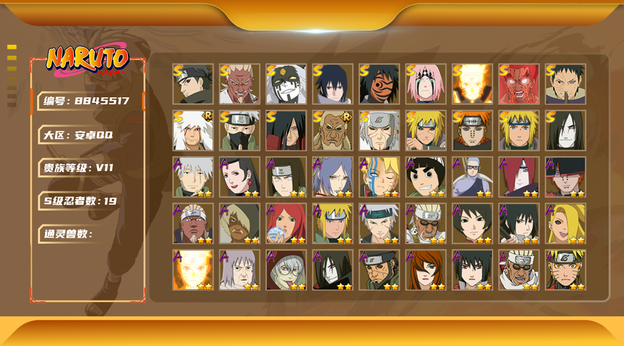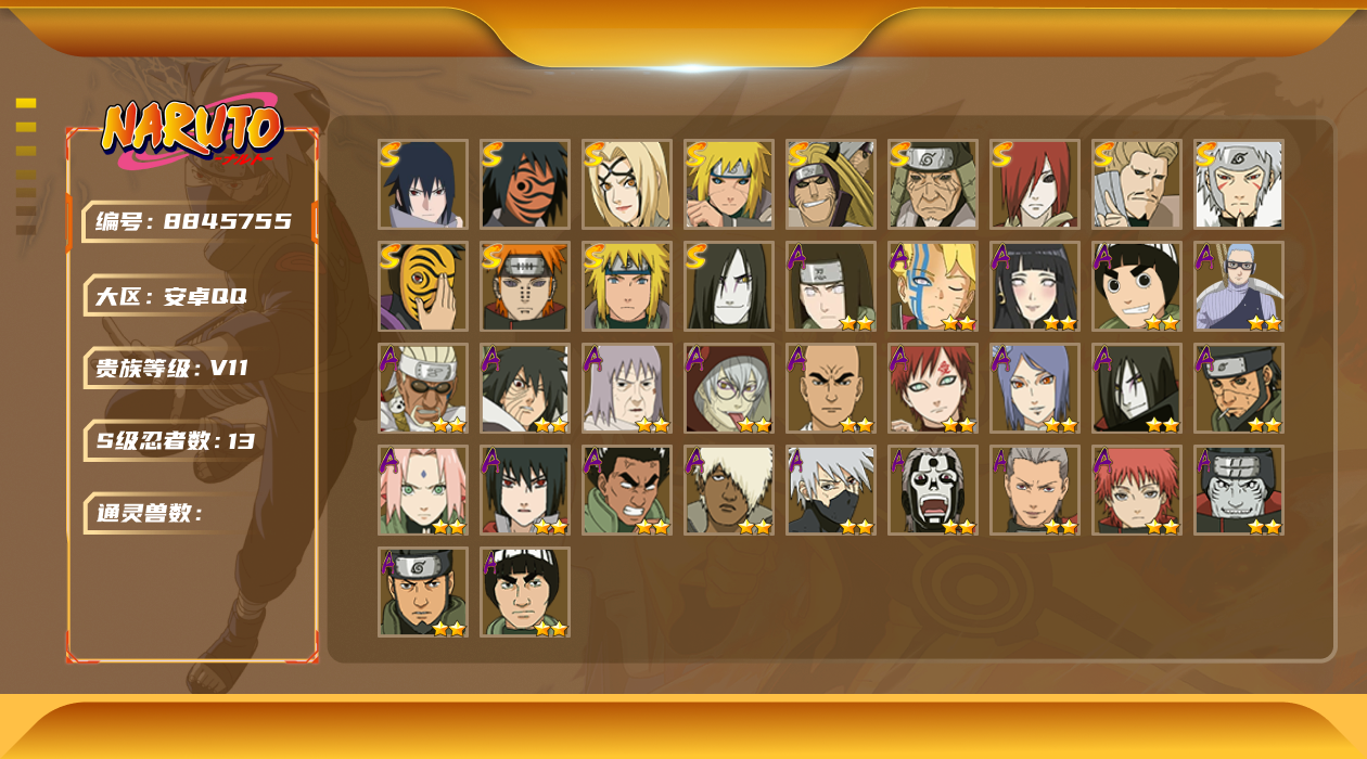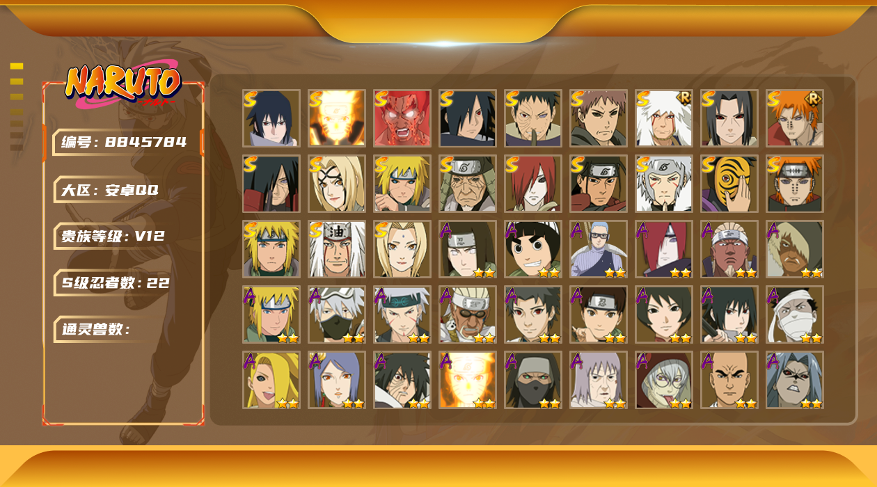 [8845659]战斗力:1014w;段位:上忍1阶;本服排名:518;战区排名:未上榜;vip12级;s忍19个;a忍39个;通灵兽18个;s忍:千手柱间(普通)大蛇丸(普通)忍界大战宇智波带土猿飞日斩(普通)波风水门(普通)永恒万花筒宇智波佐助宇智波斑(普通)天道佩恩秽土转生解宇智波斑纲手(普通)秽土转生波风水门秽土转生长门仙人模式自来也秽土转生千手扉间秽土转生猿飞日斩秽土转生金角银角死门迈特凯须佐能乎宇智波鼬二代目水影鬼灯幻月;a忍:5星迈特凯(普通)5星猿飞阿斯玛(普通)5星干柿鬼鲛(普通)4星疾风传我爱罗4星蝎(普通)3星飞段(普通)忍者之路神秘面具男万花筒写轮眼宇智波佐助疾风传咒印宇智波佐助百豪春野樱忍界大战秋道丁次忍界大战日向宁次忍界大战李洛克万花筒写轮眼旗木卡卡西宇智波止水(普通)新春限定宇智波止水新春限定波风水门青年波风水门新春限定我爱罗忍界大战我爱罗忍界大战勘九郎近松十人卫千代侠隐江湖照美冥五代目水影照美冥奇拉比(普通)青年艾侠隐江湖药师兜青年长门小南(普通)夏日泳装小南绝晓大蛇丸宇智波鼬(普通)迪达拉(普通)死司凭血飞段暴怒宇智波带土五代目雷影达鲁伊桃式显现漩涡博人四代目土影黑土;通灵兽:忍犬(普通)蓝蛇蛤蟆吉忍龟镰鼬猿魔山椒鱼蜃蛞蝓(普通)鲛鲨蛤蟆仙人蛤蟆健乌鸦(普通)熊猫蛤蟆龙砂之守鹤蛤蟆广梦貘;时装:百战波风水门百战大蛇丸;详情看图【889区】【安卓qq】【可二次实名】