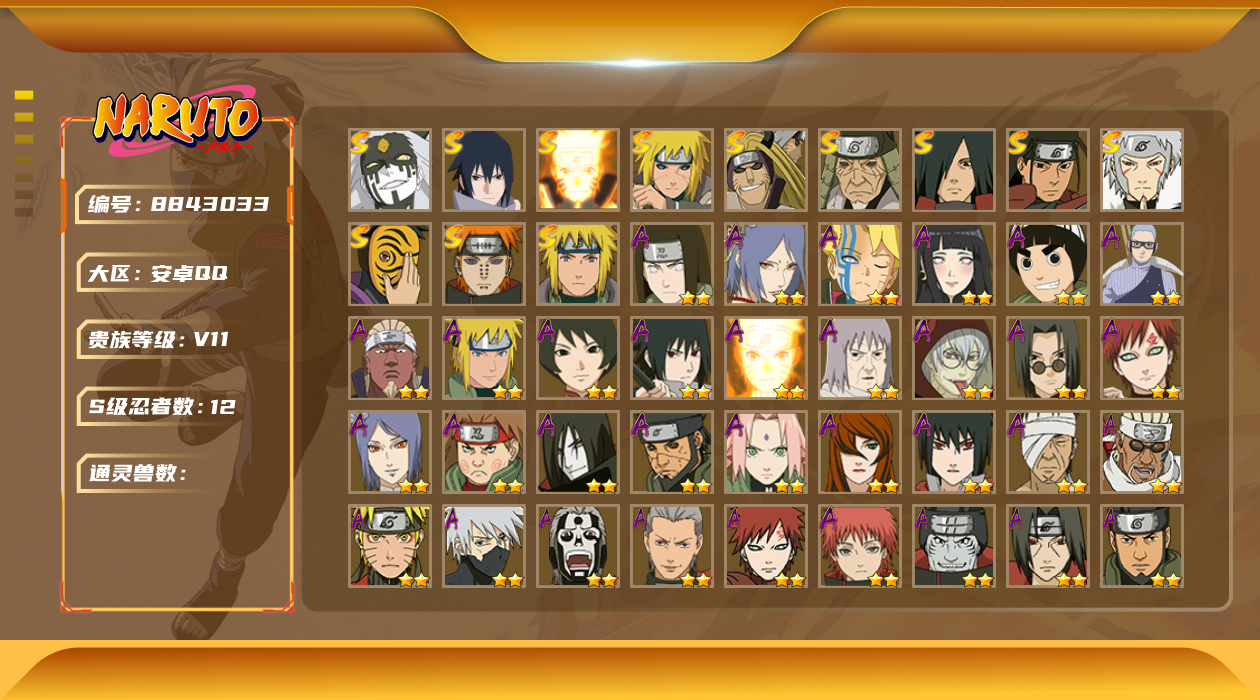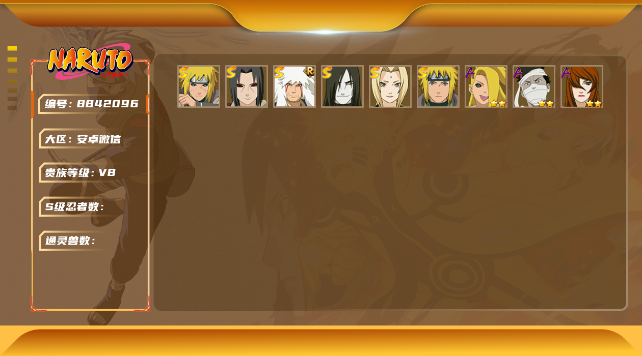 [8842096]xr37953-战力507w-安v-【s级忍者】:波风水门「秽土转生」3星,宇智波鼬「秽土转生」3星,自来也「舞之豪杰」3星,大蛇丸3星,纲手3星,波风水门3星 【a级忍者】:迪达拉「秽土转生」2星,桃地再不斩「漂泊武士」2星,照美冥「五代目水影」2星
