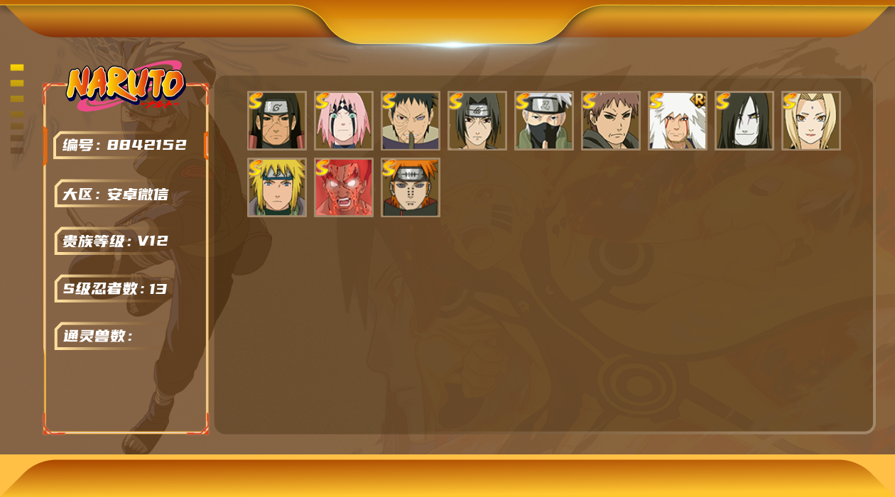 [8842152]xr37937-安卓微信-13s 26a 千手柱间「秽土转生」3星,春野樱「忍界大战」3星,宇智波带土「忍界大战」3星,宇智波鼬「须佐能乎」3星,旗木卡卡西「须佐能乎」3星,罗砂「四代目风影」3星,自来也「舞之豪杰」3星,大蛇丸3星,纲手3星,波风水门3星,迈特凯「死门」3星,佩恩「天道」3星