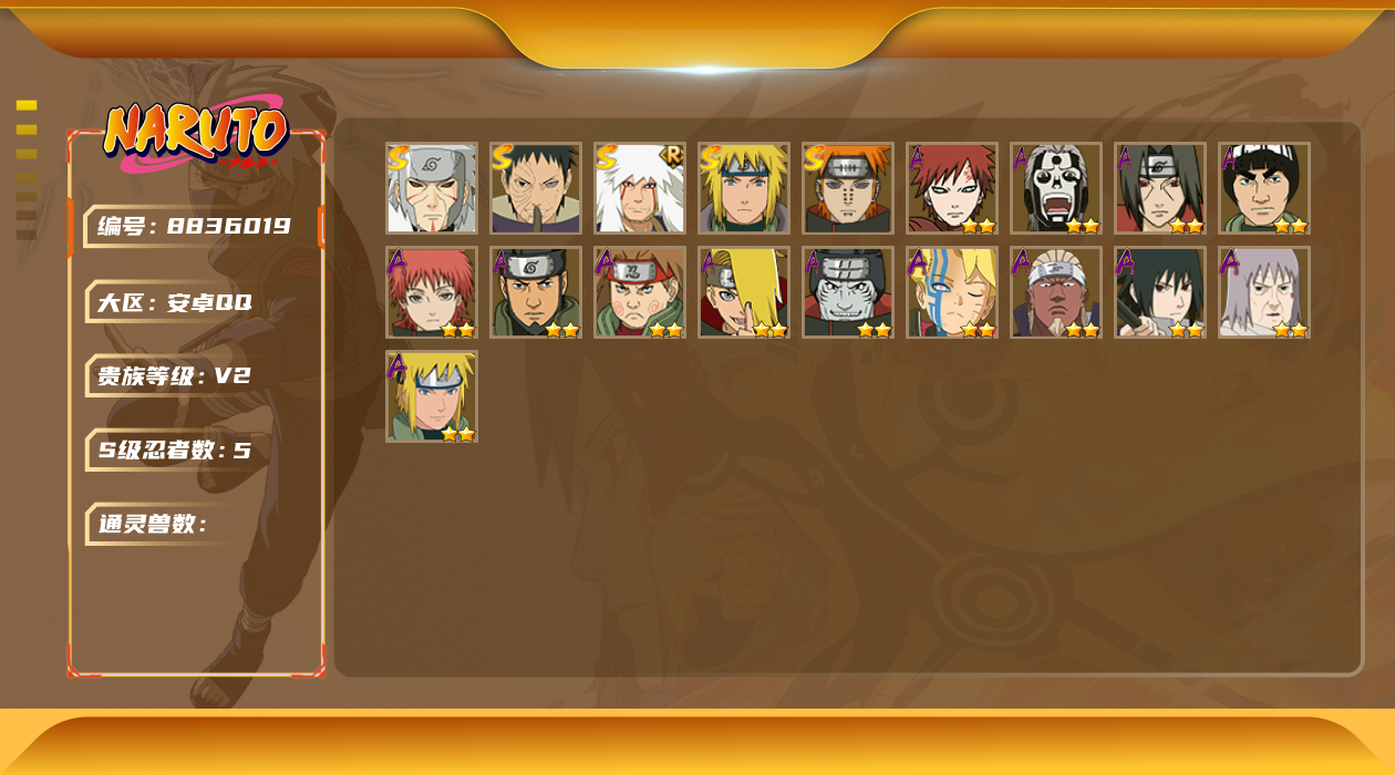 [8835761]xr38116-安卓qq-5s级忍者数-10a级忍者数 【s级忍者】:艾「忍界大战」3星,宇智波止水「须佐能乎」3星,旗木卡卡西「须佐能乎」3星,自来也「舞之豪杰」3星,佩恩「天道」3星 【a级忍者】:干柿鬼鲛2星,漩涡博人「桃式显现」2星,迈特凯2星,旗木卡卡西「幻之真容」2星,我爱罗「疾风传」2星,猿飞阿斯玛2星,宇智波鼬2星,宇智波佐助「须佐能乎」2星,李洛克「忍界大战」2星,宇智波泉奈2星