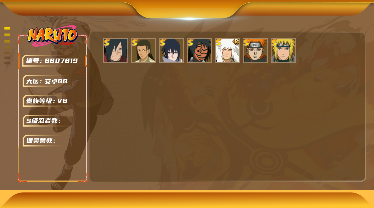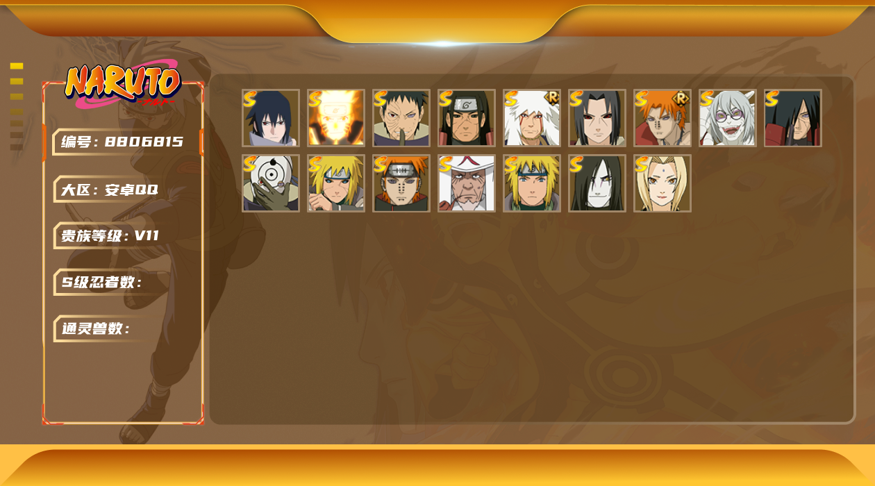 [8807819]v8 7s忍 15a忍 101忍 938s碎片 15通灵 500w战力 上忍 金币3556。yy8658 永恒万花筒佐助舞之豪杰自来也水门创立柱间秽土解斑红夜带土天道佩恩凯阿斯玛鬼鲛须佐佐助忍战宁次青年水门疾风传我爱罗不风不缘蝎鼬迪达拉死司飞段六代水影博人传黑土