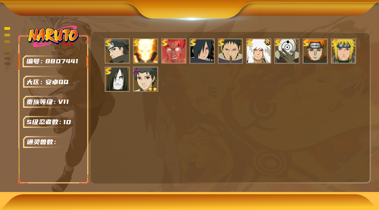 【hyn3528】v8/战力149w/s忍3/a忍7/通灵兽9/3星自来也「舞之豪杰」/2星宇智波泉奈/2星迪达拉/2星角都「秽土转生」/2星宇智波鼬/2星小南「漂泊浪客」/3星宇智波斑「秽土转生·解」/3星佩恩「天道」/2星千代「近松十人卫」/2星猿飞阿斯玛