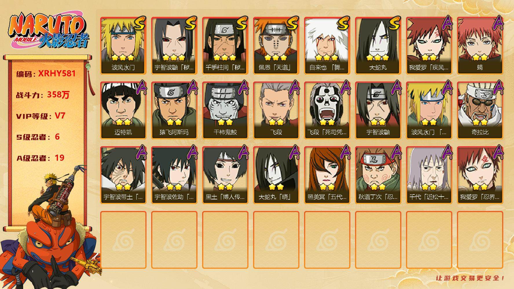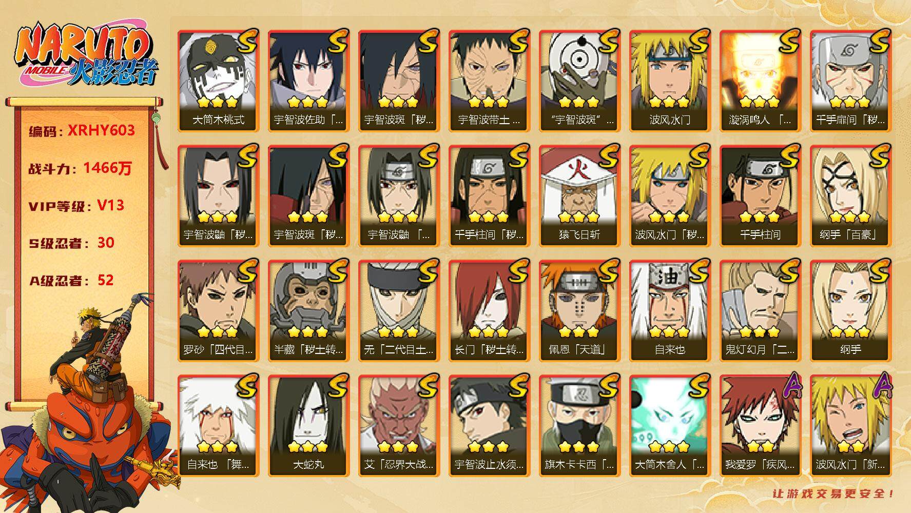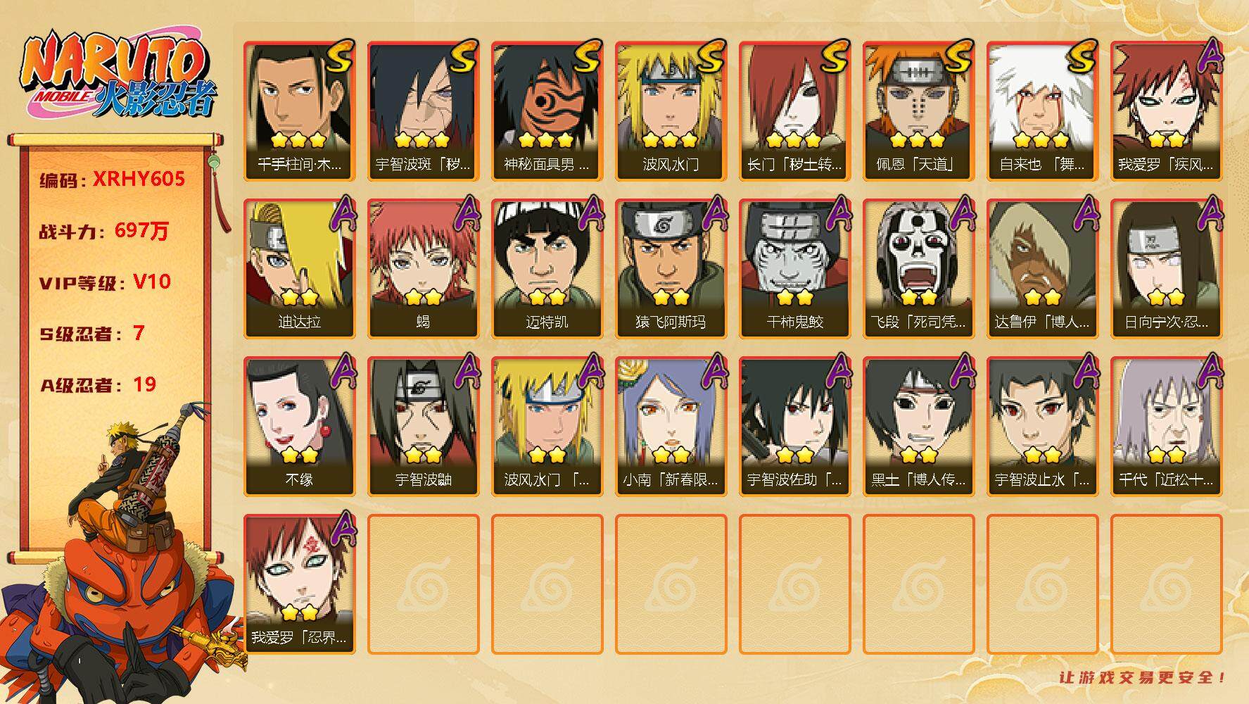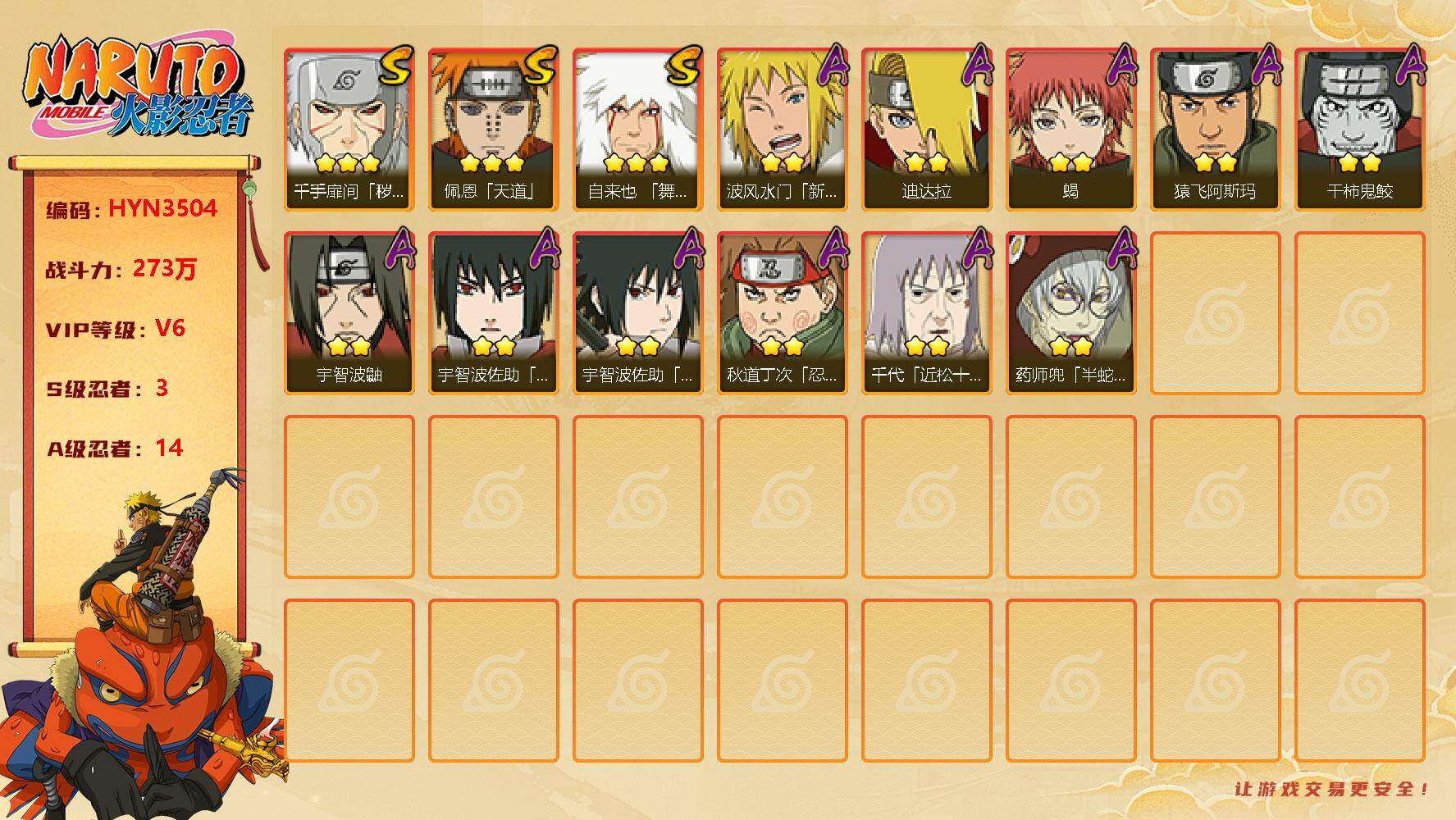 【hyn3504】v6/战力273w/s忍3/a忍14/通灵兽11/2星波风水门「新春限定」/蜃/2星宇智波鼬/2星蝎/3星佩恩「天道」/2星秋道丁次「忍界大战」/2星角都「秽土转生」/3星千手扉间「秽土转生」/蓝蛇/砂之守鹤/2星蝎「绯流琥」/3星自来也「舞之豪杰」/2星药师兜「半蛇斗篷」/蛤蟆吉/2星猿飞阿斯玛/镰鼬/2星宇智波佐助「万花筒写轮眼」/2星宇智波泉奈/2星迪达拉/忍犬/山椒鱼/2星干柿鬼鲛/2星宇智波佐助「须佐能乎」/猿魔/蛤蟆仙人/2星千代「近松十人卫」/忍龟/鲛鲨