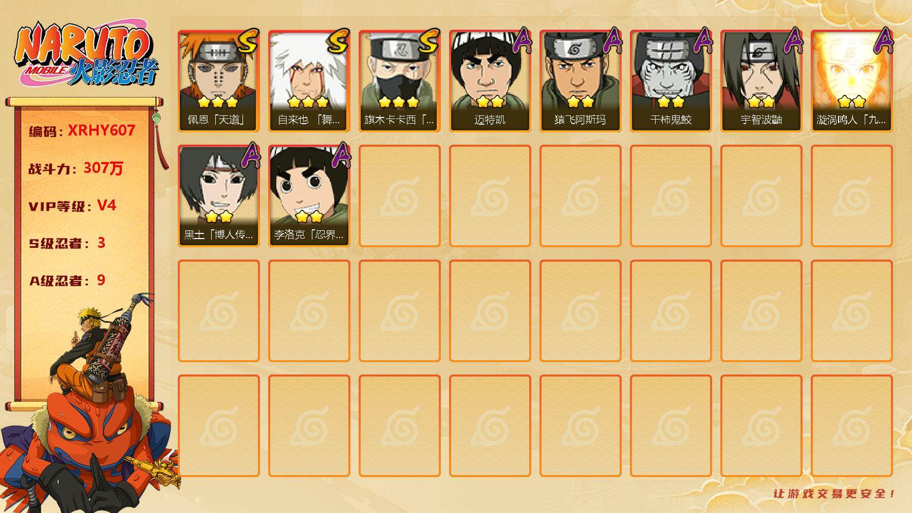 [8789546]xr38091-安卓q-区服3975-3s级忍者数-9a级忍者数 【s级忍者】:旗木卡卡西「须佐能乎」3星,自来也「舞之豪杰」3星,佩恩「天道」3星 【a级忍者】:干柿鬼鲛2星,漩涡鸣人「九尾查克拉」2星,迈特凯2星,蝎「绯流琥」2星,猿飞阿斯玛2星,宇智波鼬2星,李洛克「忍界大战」2星,黑土「博人传」2星,宇智波泉奈2星