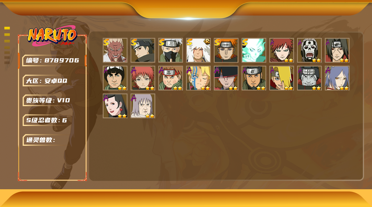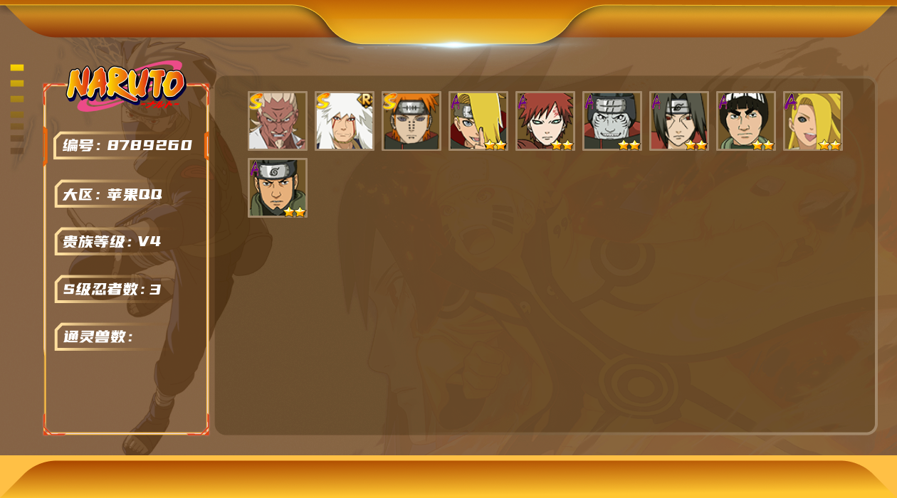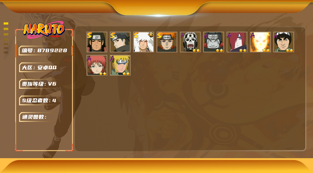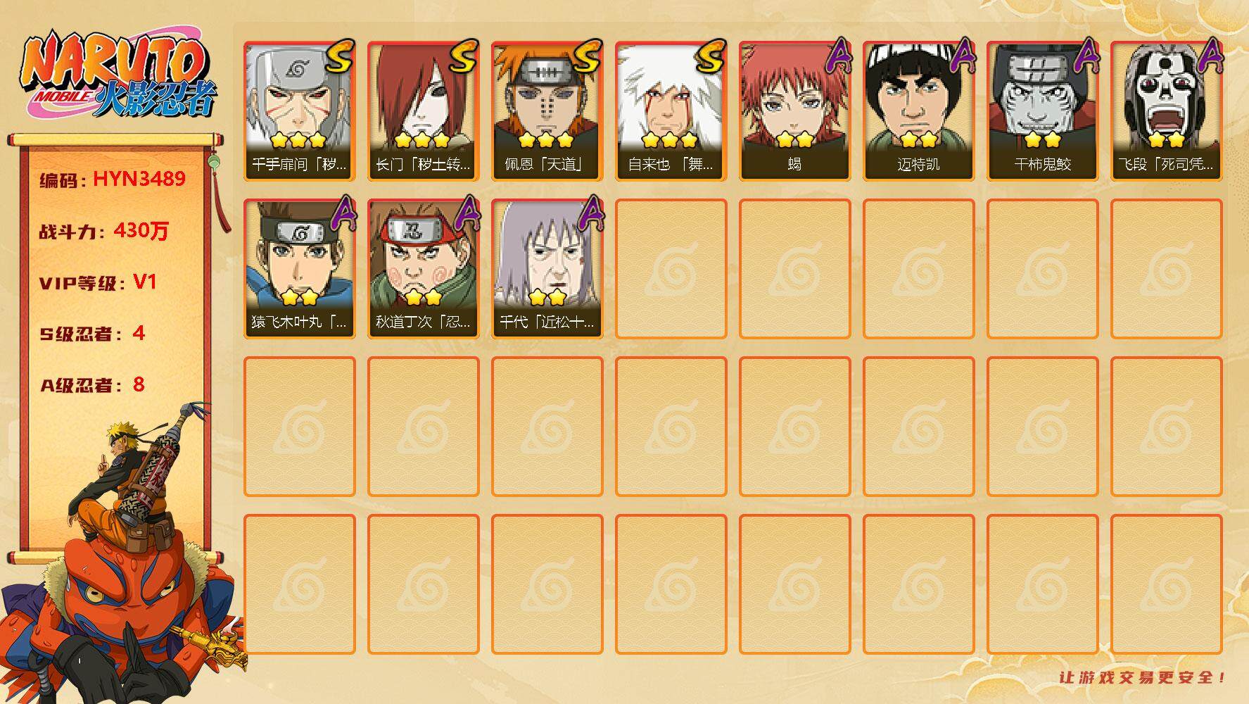 【hyn3489】v1/战力430w/s忍4/a忍8/通灵兽12/3星自来也「舞之豪杰」/蜃/2星飞段「死司凭血」/2星迈特凯/蛤蟆健/2星蝎/蛤蟆吉/3星佩恩「天道」/镰鼬/2星宇智波泉奈/2星秋道丁次「忍界大战」/忍犬/山椒鱼/2星干柿鬼鲛/3星千手扉间「秽土转生」/蓝蛇/砂之守鹤/猿魔/蛤蟆仙人/2星猿飞木叶丸「博人传」/2星千代「近松十人卫」/3星长门「秽土转生」/忍龟/鲛鲨