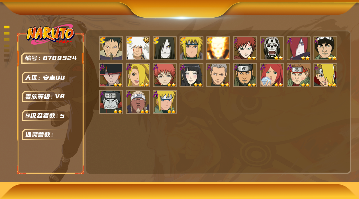 [8789524]xr38085-安卓q-区服2432-可修改-5s级忍者数-18a级忍者数 【s级忍者】:宇智波带土「忍界大战」3星,自来也「舞之豪杰」3星,大蛇丸3星,波风水门3星,漩涡鸣人「九喇嘛连结」3星 【a级忍者】:艾「青年」2星,长门「青年」2星,波风水门「青年」2星,达鲁伊「博人传」2星,迪达拉2星,迪达拉「秽土转生」2星,飞段2星,飞段「死司凭血」2星,干柿鬼鲛2星,迈特凯2星,我爱罗「疾风传」2星,蝎2星,猿飞阿斯玛2星,日向雏田「最终章」2星,佩恩·六道「漂泊浪客」2星,黑土「博人传」2星,秋道丁次「忍界大战」2星,不风2星