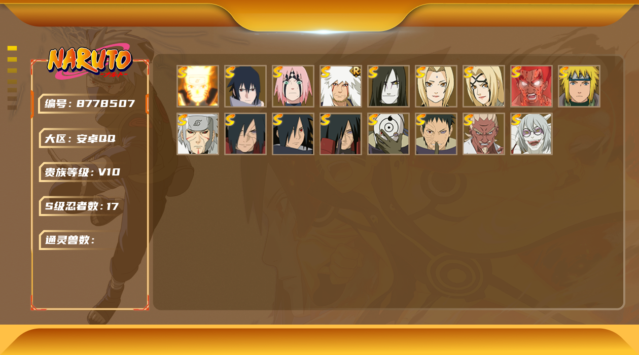 [8778507]v10 17s 可二次 s级忍者:艾「忍界大战」宇智波斑「秽土转生·解」宇智波佐助「永恒万花筒」春野樱 「忍界大战」漩涡鸣人 「九喇嘛连结」迈特凯「死门」宇智波斑 「木叶创立」宇智波带土 「忍界大战」自来也 「舞之豪杰」药师兜「仙人模式」宇智波斑「秽土转生」“宇智波斑” 「白面具」千手扉间「秽土转生」纲手「百豪」波风水门大蛇丸纲手