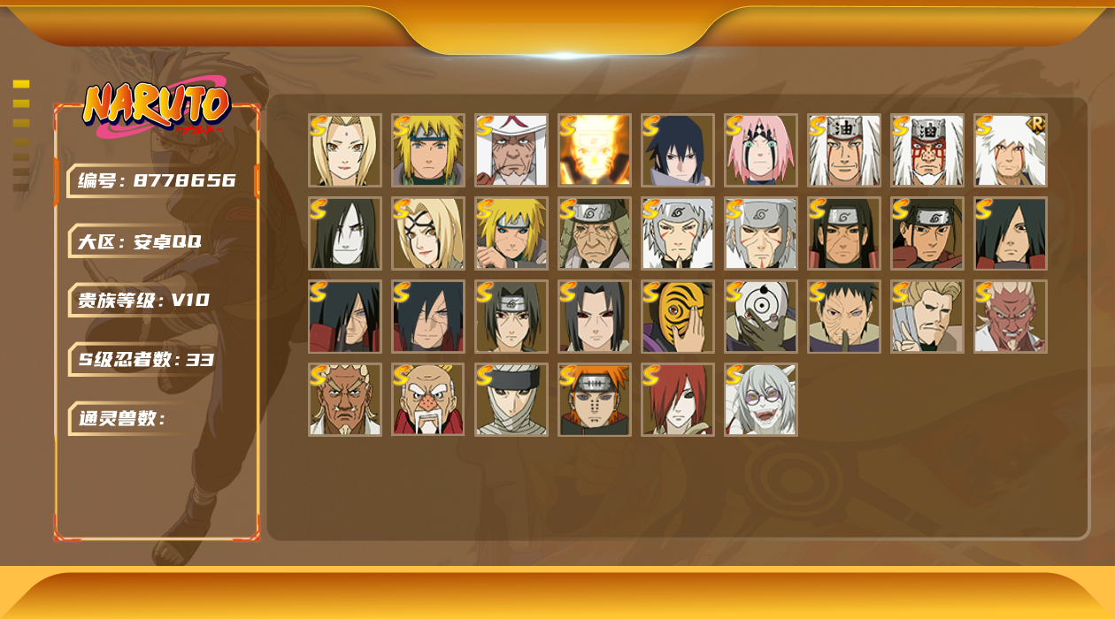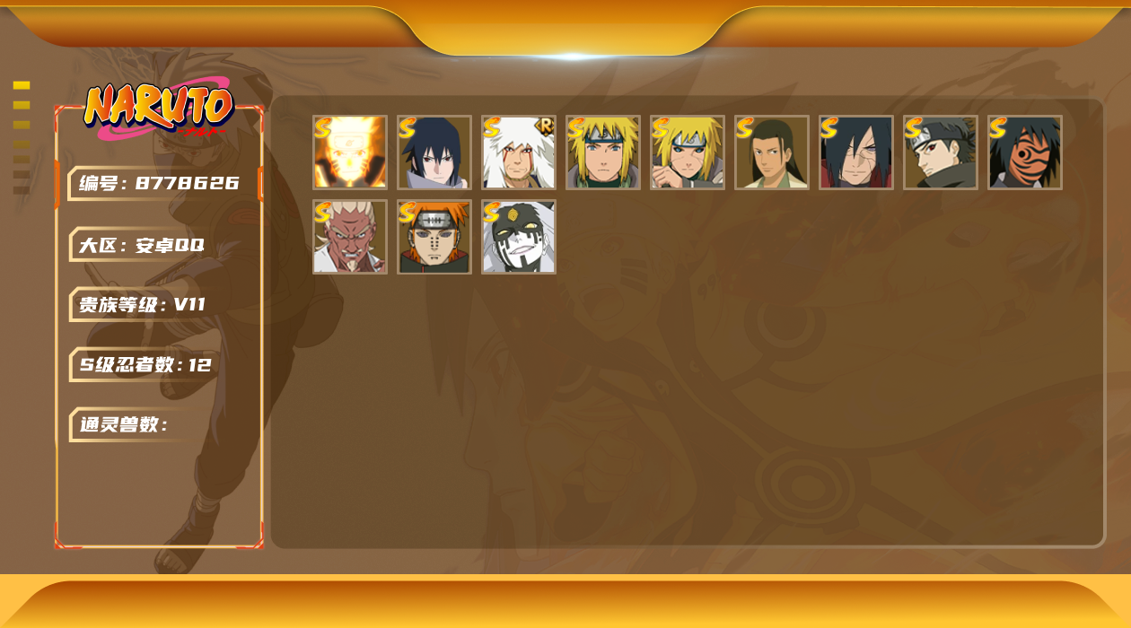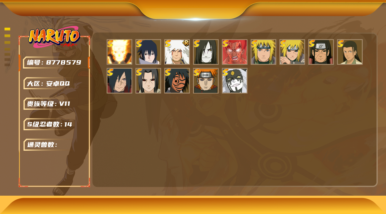 [8778644]v11 16s 可二次 s级忍者:艾「忍界大战」宇智波斑「秽土转生·解」宇智波佐助「永恒万花筒」神秘面具男 「红夜之刃」漩涡鸣人 「九喇嘛连结」千手柱间「秽土转生」自来也 「舞之豪杰」宇智波斑「秽土转生」“宇智波斑” 「白面具」千手扉间「秽土转生」波风水门「秽土转生」佩恩「天道」猿飞日斩波风水门大蛇丸纲手