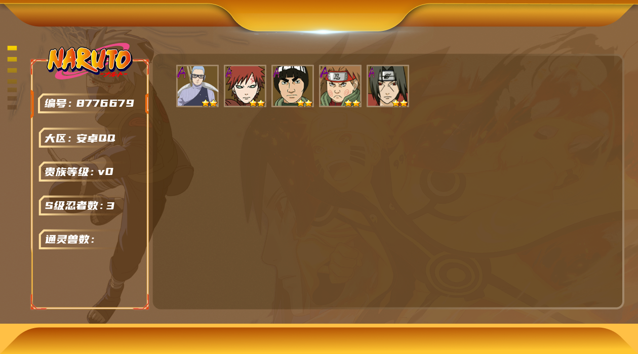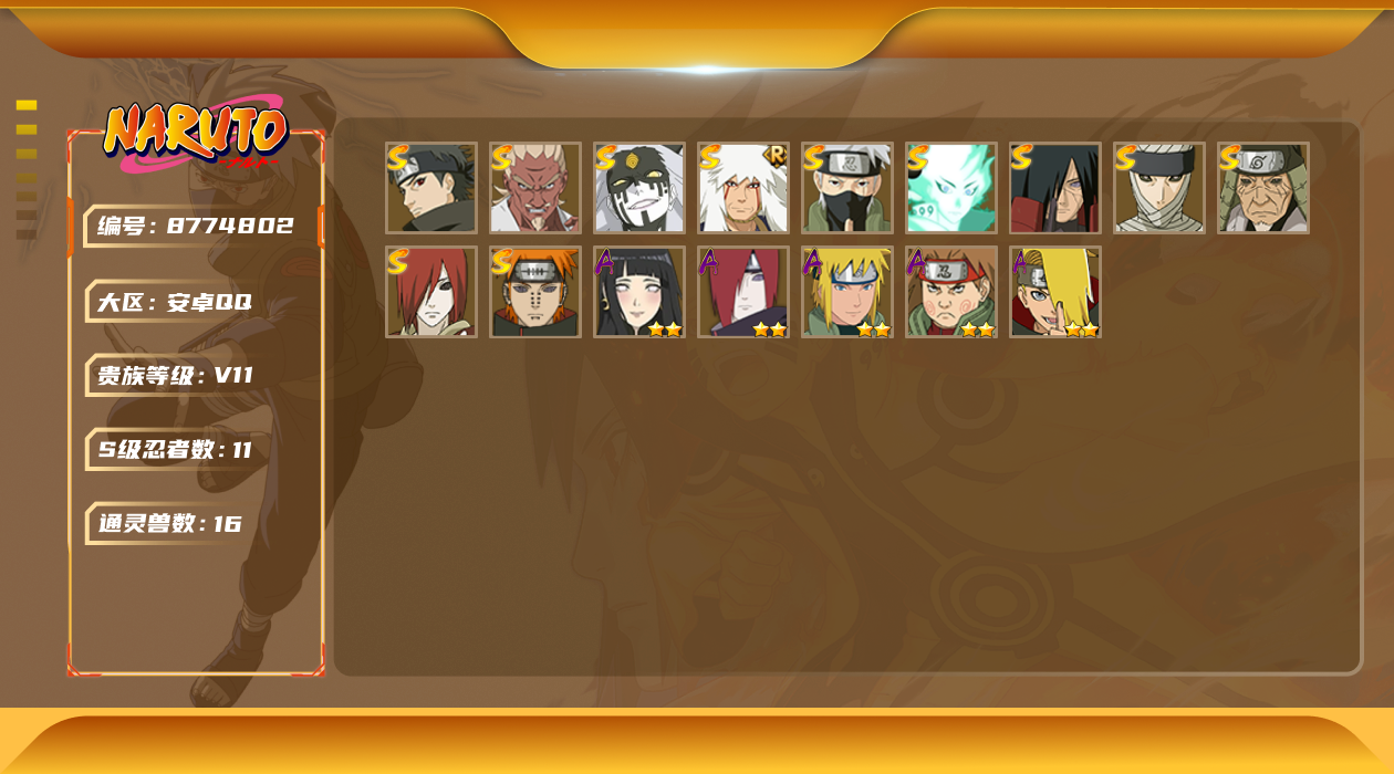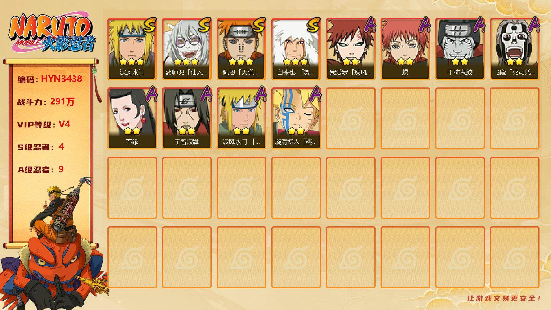 【hyn3438】v4/战力291w/s忍4/a忍9/通灵兽11/3星自来也「舞之豪杰」/2星我爱罗「疾风传」/蜃/2星飞段「死司凭血」/2星宇智波鼬/2星蝎/蛤蟆吉/3星佩恩「天道」/镰鼬/3星波风水门/2星宇智波泉奈/忍犬/山椒鱼/2星干柿鬼鲛/2星漩涡博人「桃式显现」/2星不缘/蓝蛇/砂之守鹤/猿魔/蛤蟆仙人/3星药师兜「仙人模式」/忍龟/鲛鲨/2星波风水门「青年」