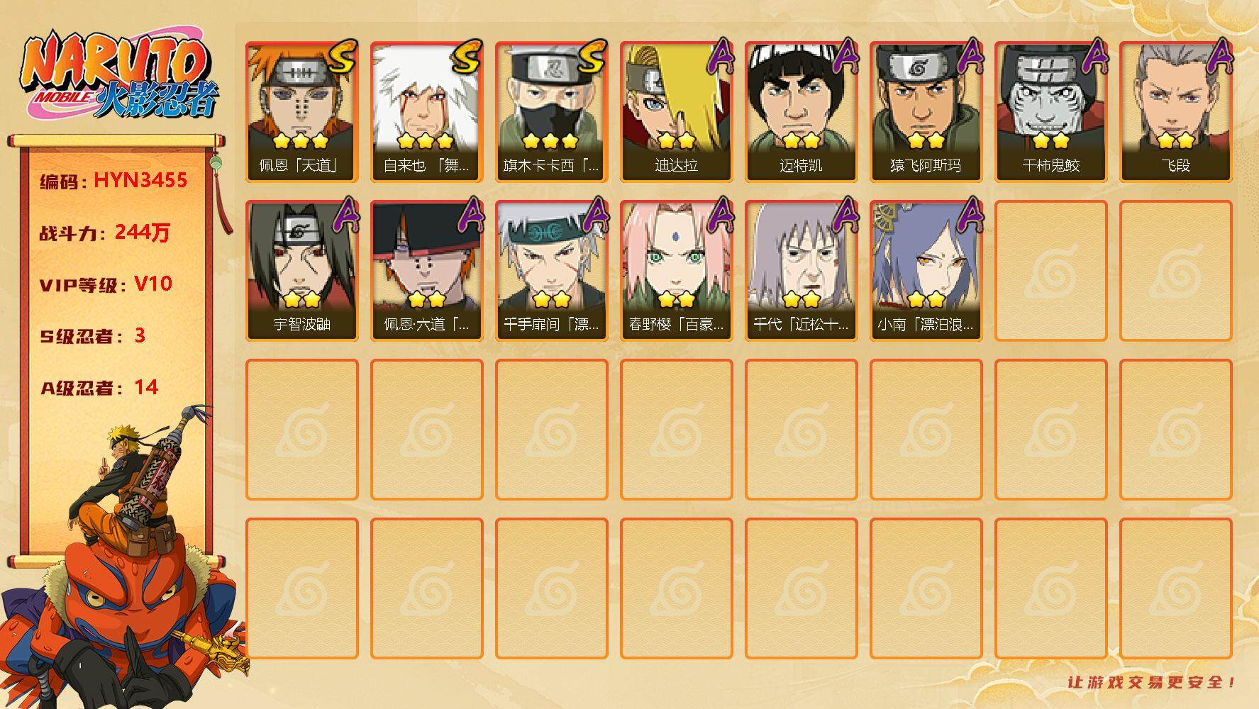 【hyn3455】v10/战力244w/s忍3/a忍14/通灵兽12/蜃/2星宇智波鼬/3星旗木卡卡西「须佐能乎」/2星迈特凯/3星佩恩「天道」/2星角都「秽土转生」/蓝蛇/砂之守鹤/2星蝎「绯流琥」/3星自来也「舞之豪杰」/2星千手扉间「漂泊武士」/2星春野樱「百豪」/蛞蝓/2星佩恩·六道「漂泊浪客」/蛤蟆吉/2星飞段/2星猿飞阿斯玛/镰鼬/2星宇智波泉奈/2星迪达拉/忍犬/山椒鱼/2星干柿鬼鲛/2星小南「漂泊浪客」/猿魔/蛤蟆仙人/2星千代「近松十人卫」/忍龟/鲛鲨