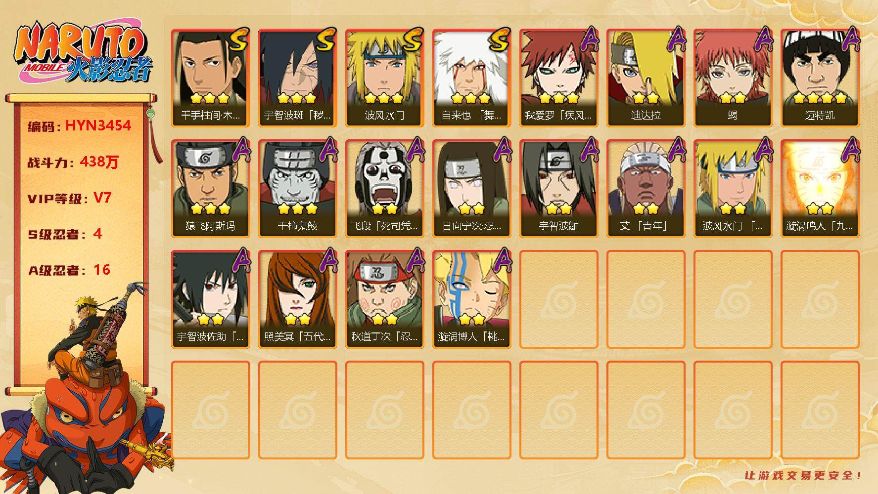 【hyn3454】v7/战力438w/s忍4/a忍16/通灵兽13/2星日向宁次「忍界大战」/蜃/2星飞段「死司凭血」/2星宇智波鼬/蛤蟆健/2星蝎/2星照美冥「五代目水影」/3星波风水门/乌鸦/2星秋道丁次「忍界大战」/2星漩涡博人「桃式显现」/3星千手柱间「木叶创立」/3星干柿鬼鲛/蓝蛇/砂之守鹤/3星我爱罗「疾风传」/2星波风水门「青年」/3星自来也「舞之豪杰」/4星迈特凯/蛤蟆吉/镰鼬/2星迪达拉/忍犬/山椒鱼/3星宇智波斑「秽土转生·解」/2星艾「青年」/2星漩涡鸣人「九尾查克拉」/3星猿飞阿斯玛/2星宇智波佐助「须佐能乎」/猿魔/蛤蟆仙人/忍龟/鲛鲨