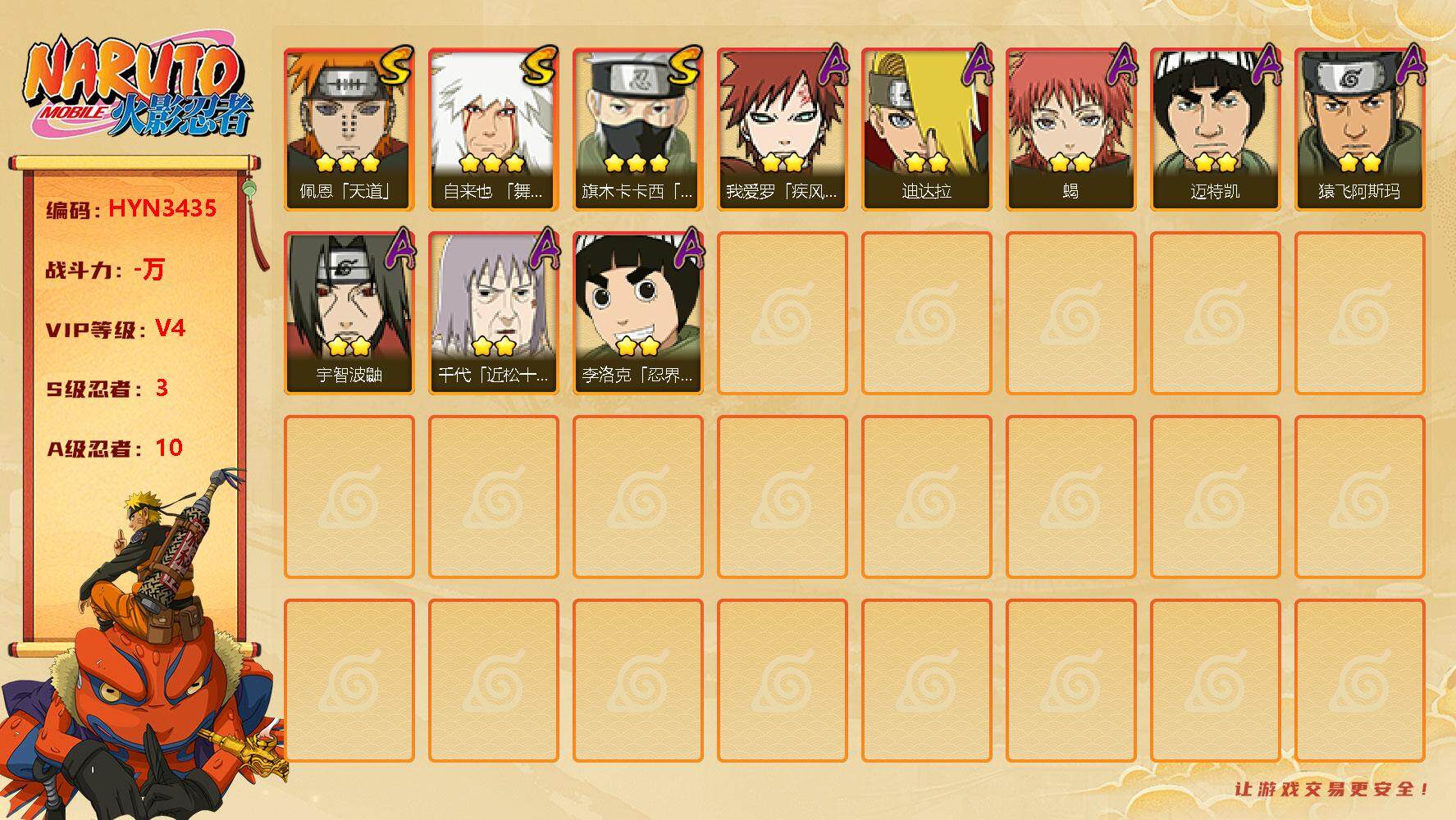 【hyn3435】v4/s忍3/a忍10/3星自来也「舞之豪杰」/2星我爱罗「疾风传」/2星宇智波鼬/3星旗木卡卡西「须佐能乎」/2星迈特凯/2星蝎/3星佩恩「天道」/2星猿飞阿斯玛/2星宇智波泉奈/2星迪达拉/2星李洛克「忍界大战」/2星千代「近松十人卫」/2星蝎「绯流琥」