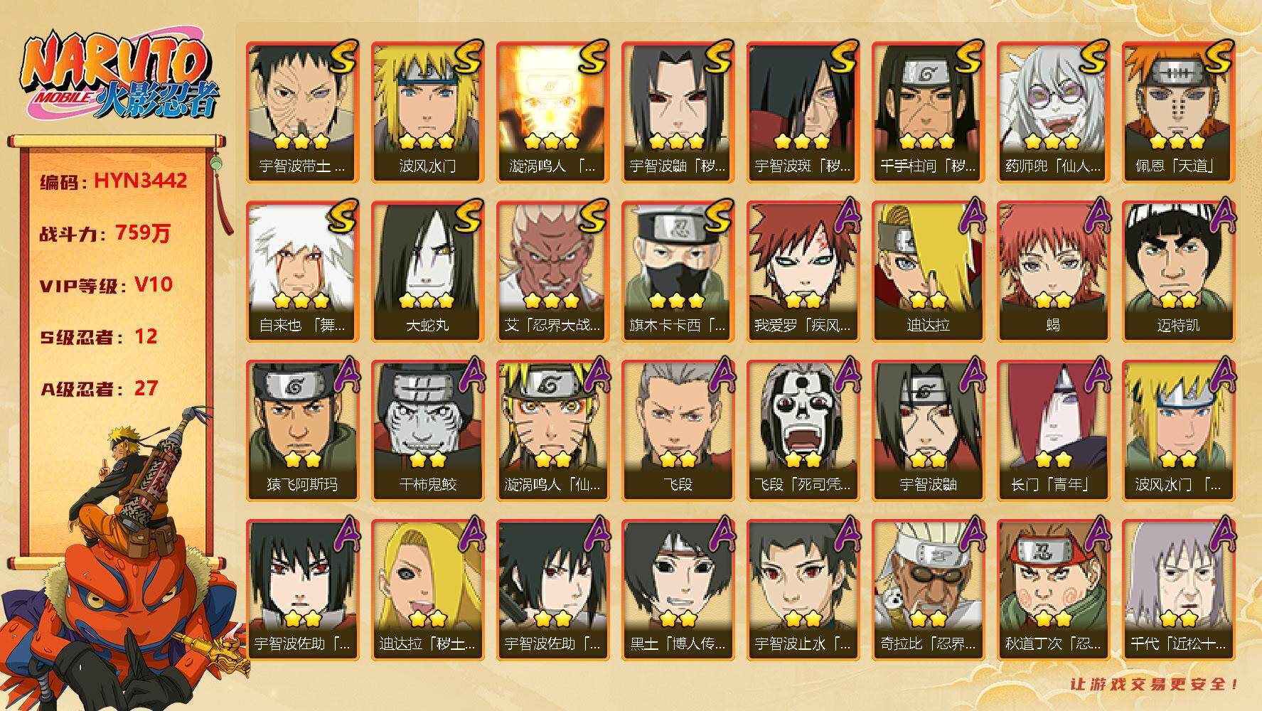 【hyn3442】v10/战力759w/s忍12/a忍27/通灵兽18/3星宇智波斑「秽土转生」/2星我爱罗「疾风传」/2星飞段「死司凭血」/2星宇智波鼬/2星药师兜「侠影江湖」/3星宇智波鼬「秽土转生」/3星旗木卡卡西「须佐能乎」/2星长门「青年」/2星迈特凯/3星宇智波带土「忍界大战」/2星蝎/3星佩恩「天道」/3星波风水门/3星漩涡鸣人「九喇嘛连结」/2星秋道丁次「忍界大战」/2星漩涡博人「桃式显现」/2星奇拉比「忍界大战」/3星千手柱间「秽土转生」/2星李洛克「忍界大战」/3星药师兜「仙人模式」/2星波风水门「青年」/2星蝎「绯流琥」/3星自来也「舞之豪杰」/2星黑土「博人传」/2星迪达拉「秽土转生」/2星飞段/2星漩涡鸣人「仙人模式」/2星猿飞阿斯玛/2星宇智波鼬「夏日限定」/2星宇智波佐助「万花筒写轮眼」/2星宇智波泉奈/2星宇智波止水「新春限定」/2星迪达拉/2星旗木卡卡西「幻之真容」/2星干柿鬼鲛/3星大蛇丸/3星艾「忍界大战」/2星宇智波佐助「须佐能乎」/2星千代「近松十人卫」