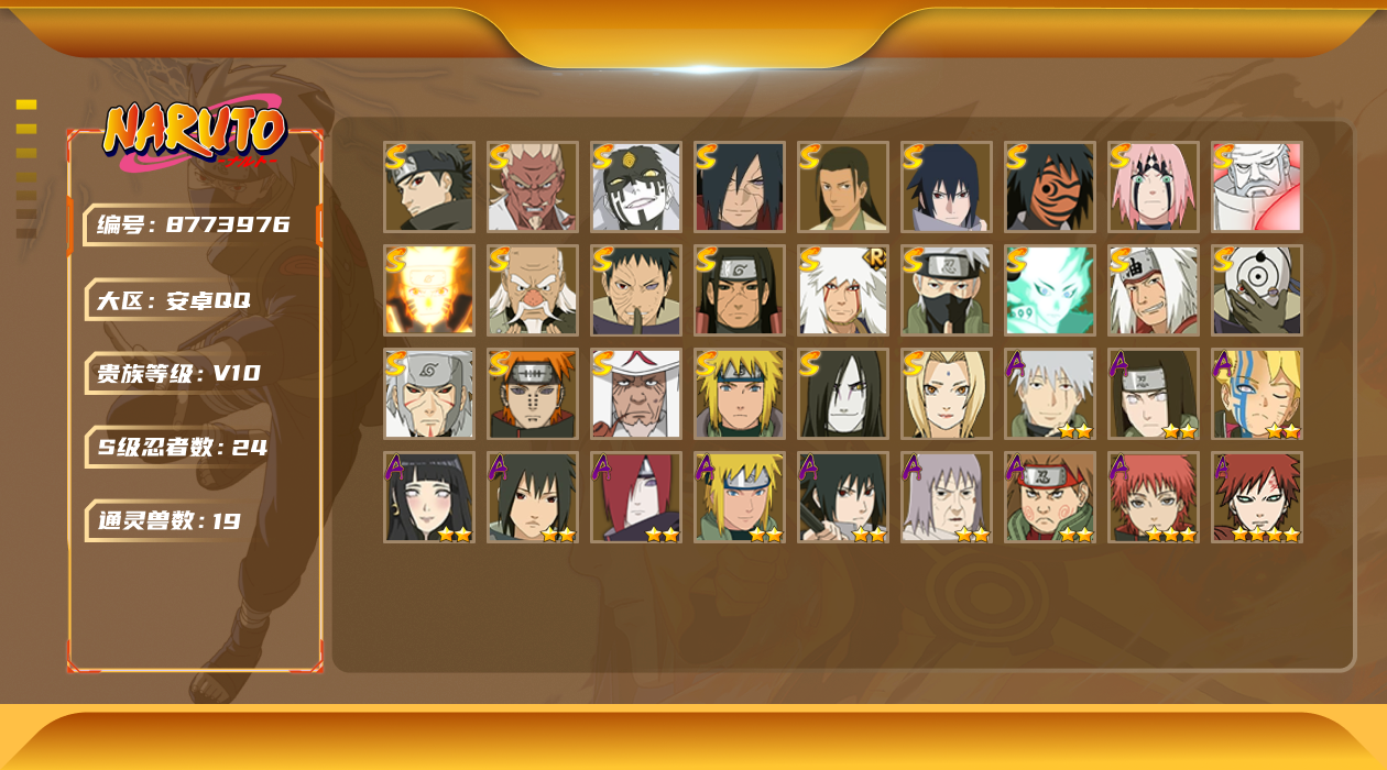 【hyn3443】v9/战力570w/s忍8/a忍18/2星日向宁次「忍界大战」/2星我爱罗「疾风传」/2星飞段「死司凭血」/2星宇智波鼬/3星宇智波佐助「永恒万花筒」/2星迈特凯/2星蝎/3星佩恩「天道」/3星波风水门/2星秋道丁次「忍界大战」/2星猿飞阿斯玛「秽土转生」/2星漩涡博人「桃式显现」/3星千手扉间「秽土转生」/3星千手柱间「木叶创立」/3星大筒木桃式/2星长十郎「六代目水影」/3星自来也「舞之豪杰」/2星猿飞阿斯玛/2星宇智波泉奈/2星宇智波止水「新春限定」/2星迪达拉/2星干柿鬼鲛/3星宇智波斑「秽土转生·解」/2星漩涡鸣人「九尾查克拉」/2星宇智波佐助「须佐能乎」/2星千代「近松十人卫」