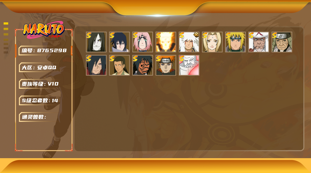 [8765298]v10 14s 可二次 s级忍者:宇智波斑「秽土转生·解」千手柱间·木叶创立宇智波佐助「永恒万花筒」神秘面具男 「红夜之刃」春野樱 「忍界大战」大筒木金式「博人传」漩涡鸣人 「九喇嘛连结」自来也 「舞之豪杰」猿飞日斩「秽土转生」佩恩「天道」猿飞日斩波风水门大蛇丸纲手