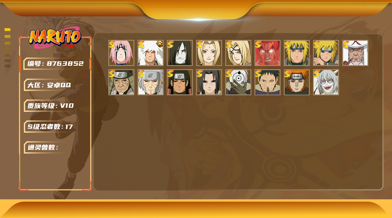 [8763852]v10 17s 可二次 s级忍者:春野樱 「忍界大战」迈特凯「死门」宇智波带土 「忍界大战」千手柱间「秽土转生」自来也 「舞之豪杰」宇智波鼬「秽土转生」药师兜「仙人模式」“宇智波斑” 「白面具」千手扉间「秽土转生」纲手「百豪」波风水门「秽土转生」猿飞日斩「秽土转生」佩恩「天道」猿飞日斩波风水门大蛇丸纲手