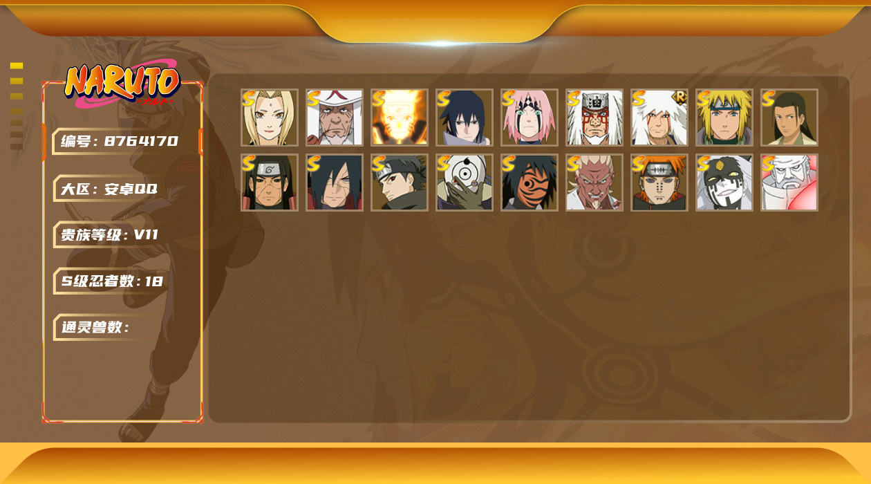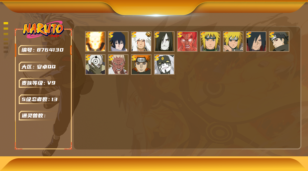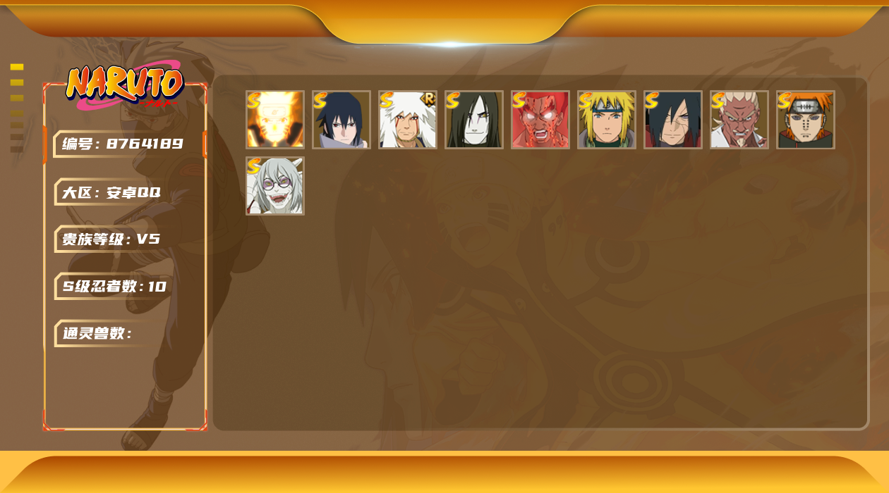 [8764189]v5 10s 可二次 s级忍者:艾「忍界大战」宇智波斑「秽土转生·解」宇智波佐助「永恒万花筒」漩涡鸣人 「九喇嘛连结」迈特凯「死门」自来也 「舞之豪杰」药师兜「仙人模式」佩恩「天道」波风水门大蛇丸