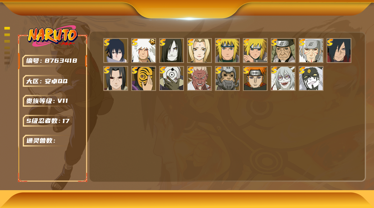 [8763510]v10 20s忍 28a忍 176忍 2566s碎片 17通灵 1215.7w战力 254名 中忍2阶 可二次 可修改实名 s级忍者:宇智波斑「秽土转生·解」千手柱间·木叶创立宇智波佐助「永恒万花筒」神秘面具男 「红夜之刃」春野樱 「忍界大战」漩涡鸣人 「九喇嘛连结」大野木 「忍界大战」迈特凯「死门」宇智波带土 「忍界大战」千手柱间「秽土转生」自来也 「舞之豪杰」旗木卡卡西「须佐能乎」宇智波鼬「秽土转生」千手扉间「秽土转生」猿飞日斩「秽土转生」神秘面具男佩恩「天道」波风水门大蛇丸纲手