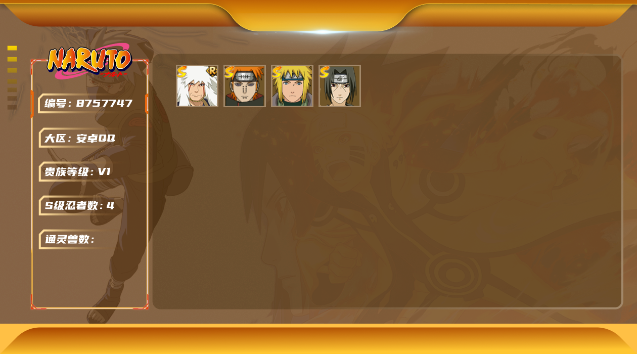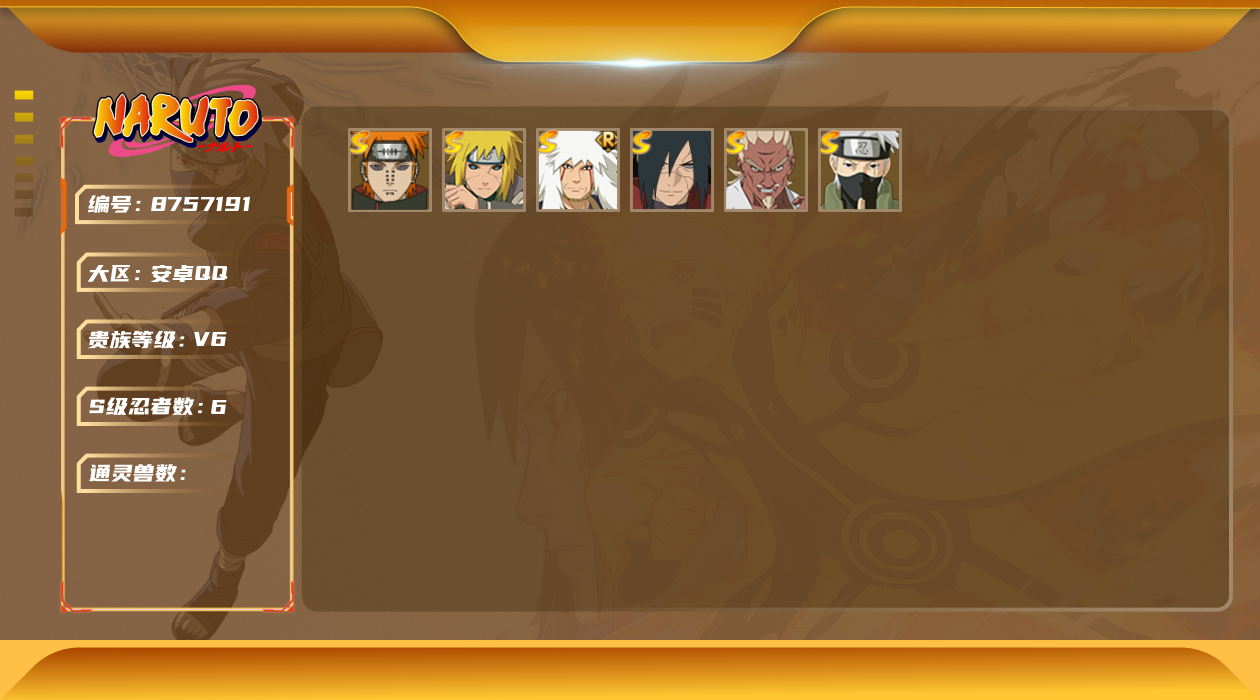 [8757191]v6 6s忍 470.1w战力 可二次 s级忍者:艾「忍界大战」宇智波斑「秽土转生·解」自来也 「舞之豪杰」旗木卡卡西「须佐能乎」波风水门「秽土转生」佩恩「天道」
