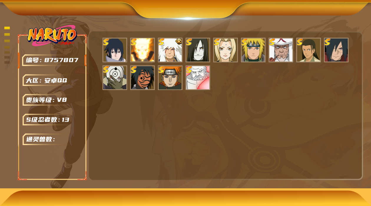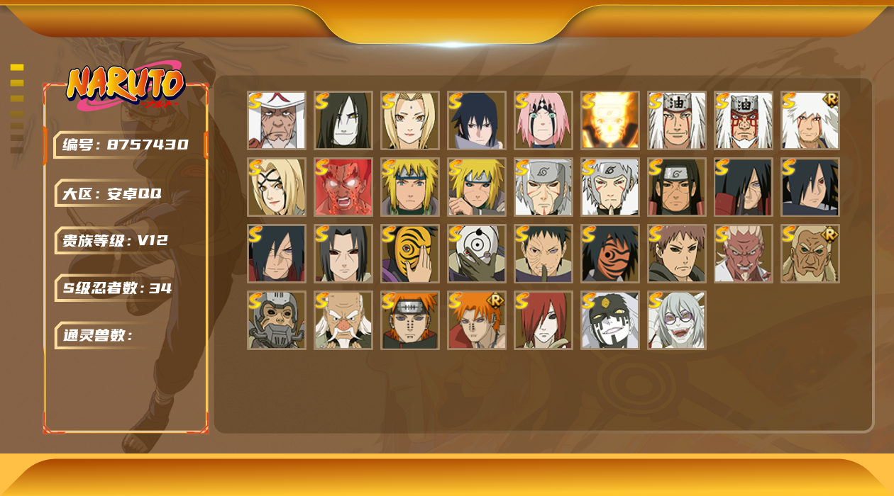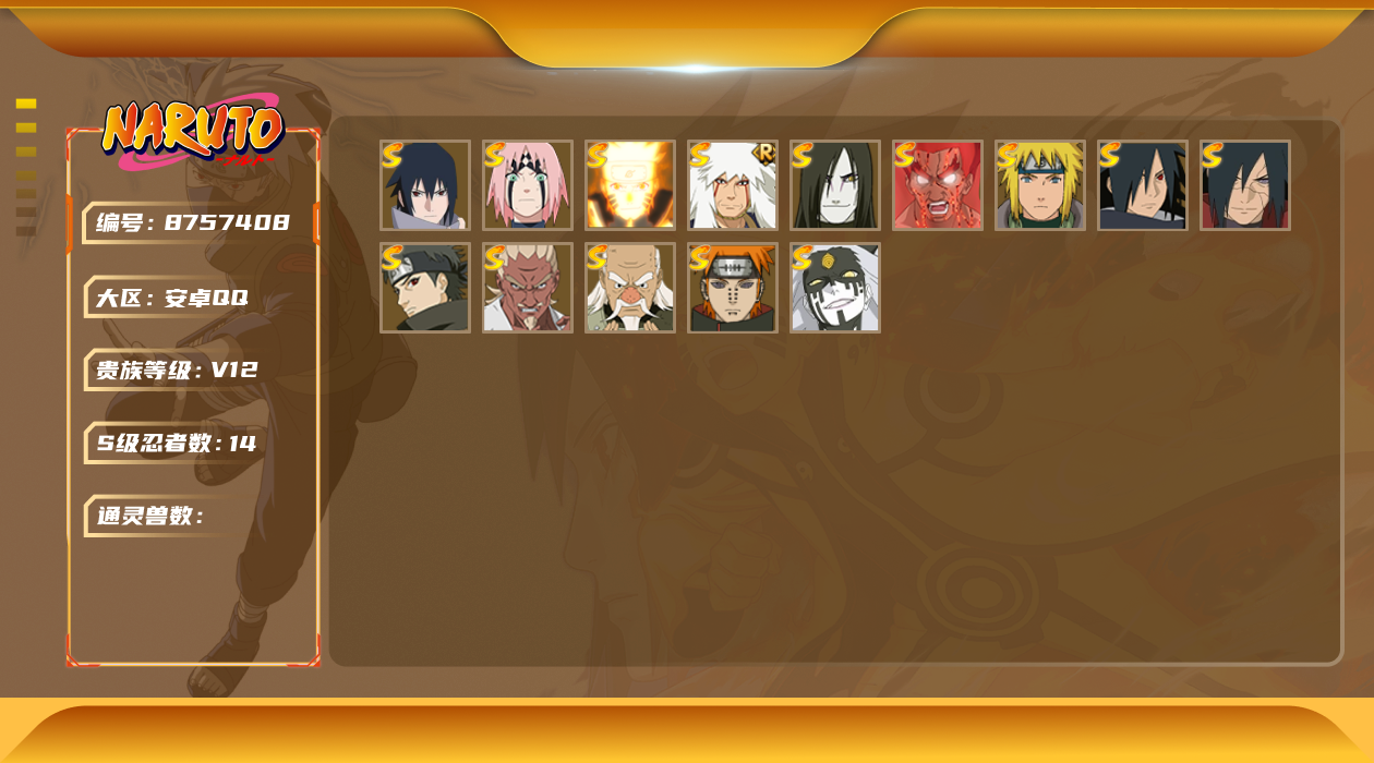 [8757807]v8 13s 可二次 s级忍者:宇智波斑「秽土转生·解」千手柱间·木叶创立宇智波佐助「永恒万花筒」神秘面具男 「红夜之刃」大筒木金式「博人传」漩涡鸣人 「九喇嘛连结」自来也 「舞之豪杰」“宇智波斑” 「白面具」佩恩「天道」猿飞日斩波风水门大蛇丸纲手