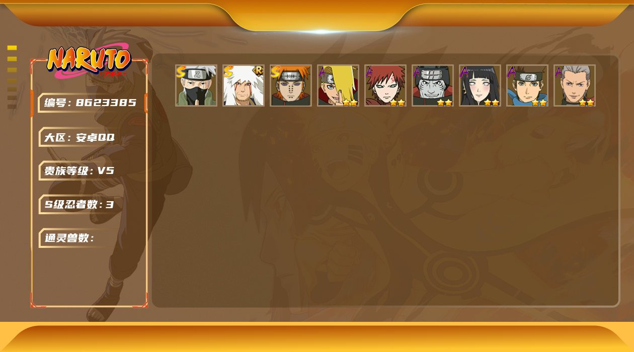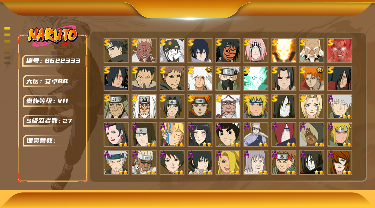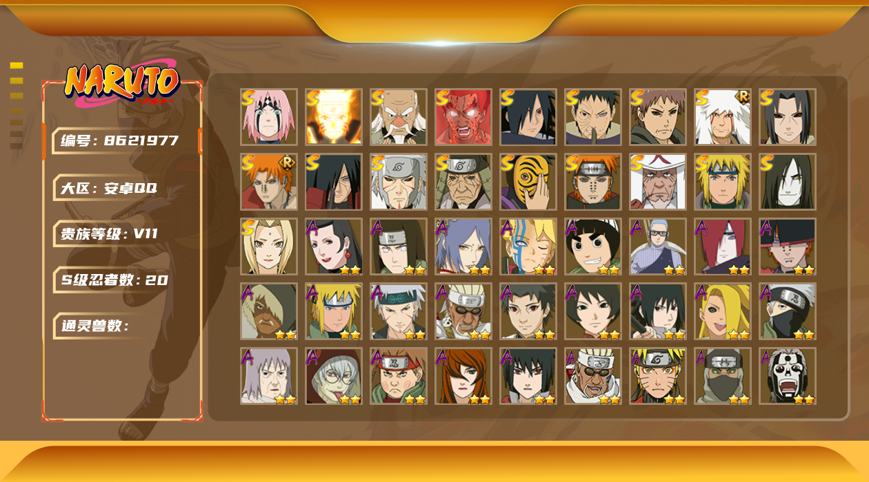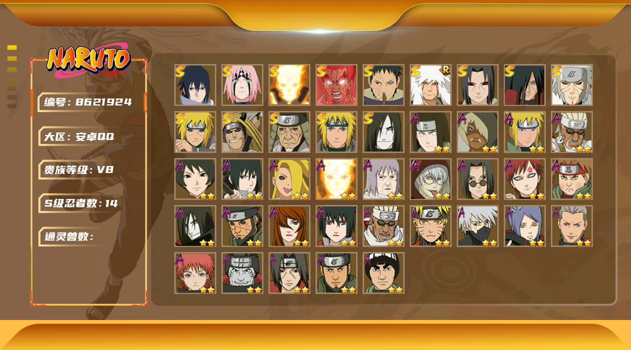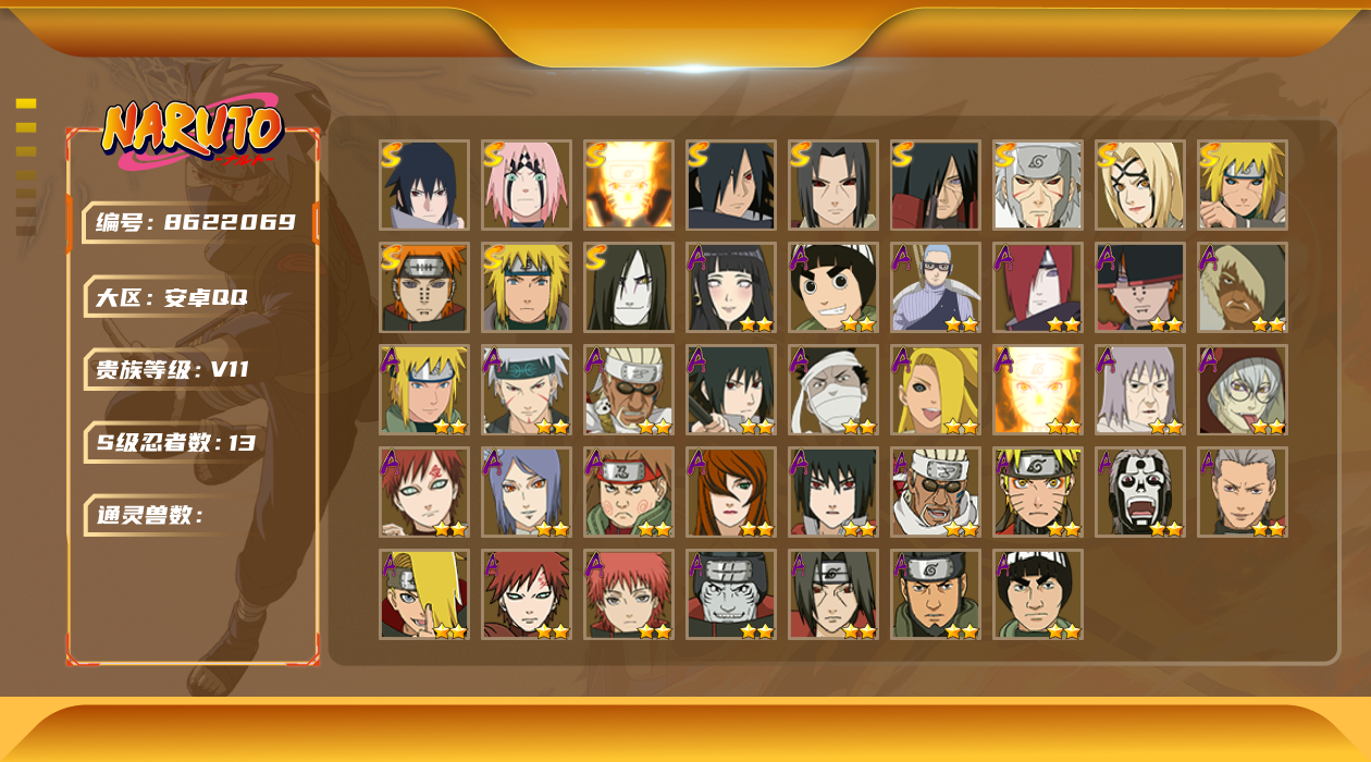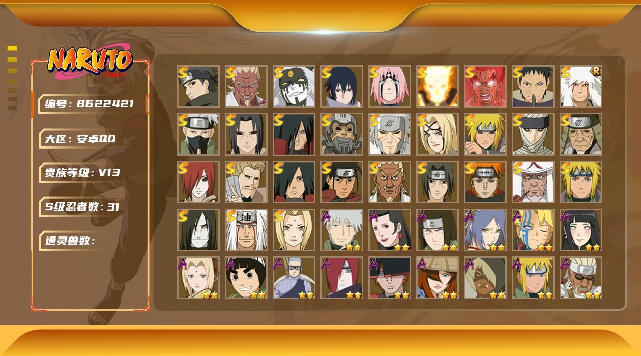 dhy543【安卓q-3255区 v4 292万战-4s 9a 70忍者-12通灵】 s;忍战艾 解斑 水门 佩恩 a;旋涡博人 宇智波鼬 秋道丁次 干柿鬼鲛"