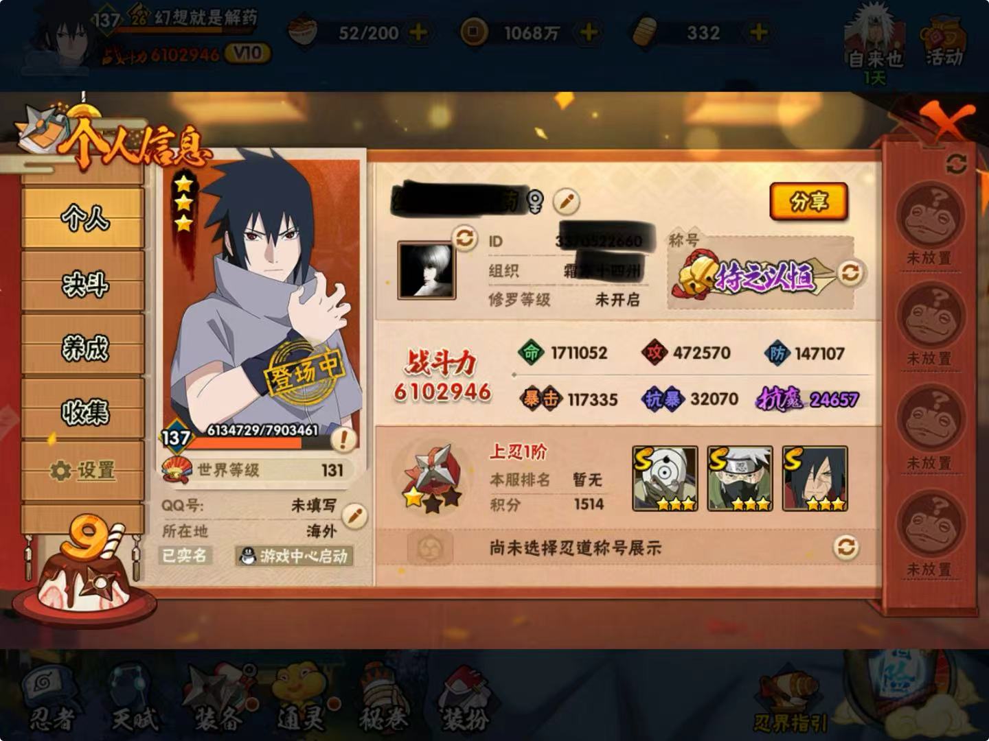 [5851405]包人脸da9226 129区 s忍者数量:15,a忍者数量:24,忍者星数:382 【操作系统】roid 【游戏区服】安卓qq 【vip等级】10 【战力值】7461692 【段位】暗部1阶 【战力排名】本服排名:1025,战区排名:未上榜 【忍者星数】382 【s忍】九喇嘛连结漩涡鸣人,永恒万花筒宇智波佐助,须佐能乎旗木卡卡西,舞之豪杰自来也,波风水门,秽土转生波风水门,秽土转生千手柱间,秽土转生宇智波斑,秽土转生·解宇智波斑,秽土转生宇智波鼬,白面具宇智波斑,忍界大战宇智波带土,天道佩恩,仙人模式药师兜,大筒木桃式 【a忍】疾风传我爱罗,干柿鬼鲛,迈特凯,猿飞阿斯玛,须佐能乎宇智波佐助,忍界大战日向宁次,忍界大战李洛克,宇智波止水,青年波风水门,五代目水影照美冥,青年艾,不风,漂泊浪客小南,晓创生角都,晓大蛇丸,蝎,宇智波鼬,秽土转生迪达拉,飞段,死司凭血飞段,暴怒宇智波带土,六代目水影长十郎,桃式显现漩涡博人,四代目土影黑土