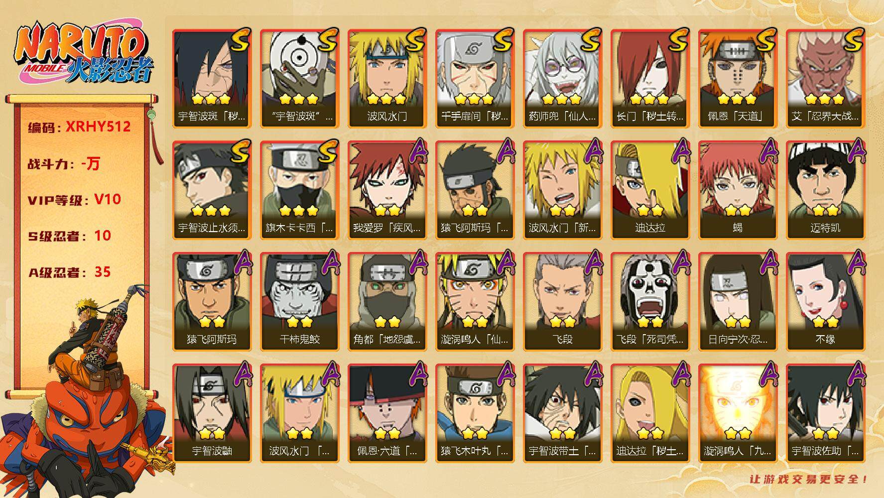 [8571837]【保证金商户】【编号44320 v12】【20s忍者34a忍者617w战力】 九喇嘛鸣人 永恒佐助 忍战樱 须佐卡卡西 舞杰自来也 传说自来也 大蛇丸 s门凯 水门 创立柱间 秽土斑 创立斑 秽土解斑 须佐止水 红夜面具男 忍战艾 忍战大野木 天道佩恩 最终章舍人 博人传桃式 凯 阿斯玛 鬼鲛 疾风传我爱罗 蝎 飞段 忍者之路面麻 宇智波泉奈 忍战丁次 忍战宁次 忍战李 最终章雏田 真容卡卡西 新春止水 青年水门 白秘技千代 忍战奇拉比 奇拉比 青年艾 武士扉间 青年长门 漂泊六道 漂泊小南 s司凭血飞段 漂泊带土 桃式显现博人 博人传长十郎 博人传黑土