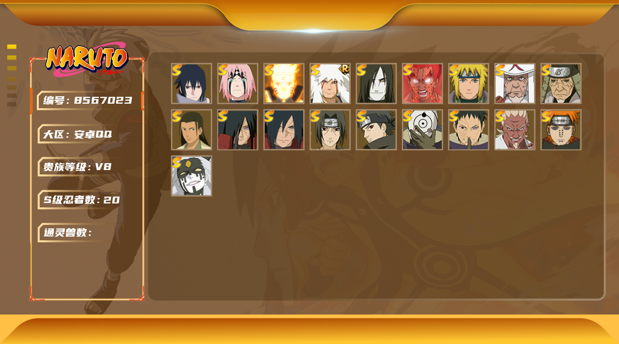[8567023]v8 20s 可二次 s级忍者:宇智波止水「须佐能乎」艾「忍界大战」大筒木桃式宇智波斑「秽土转生·解」千手柱间·木叶创立宇智波佐助「永恒万花筒」春野樱 「忍界大战」漩涡鸣人 「九喇嘛连结」迈特凯「死门」宇智波带土 「忍界大战」自来也 「舞之豪杰」宇智波斑「秽土转生」“宇智波斑” 「白面具」猿飞日斩「秽土转生」宇智波鼬 「须佐能乎」佩恩「天道」猿飞日斩波风水门大蛇丸