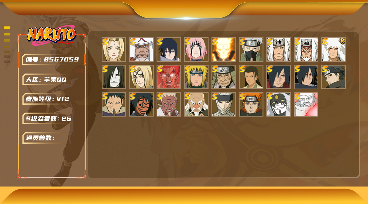 [8567059]v12 26s 可二次 s级忍者:宇智波止水「须佐能乎」艾「忍界大战」大筒木桃式宇智波斑「秽土转生·解」千手柱间·木叶创立宇智波佐助「永恒万花筒」神秘面具男 「红夜之刃」春野樱 「忍界大战」大筒木金式「博人传」漩涡鸣人 「九喇嘛连结」大野木 「忍界大战」迈特凯「死门」宇智波斑 「木叶创立」宇智波带土 「忍界大战」自来也 「舞之豪杰」旗木卡卡西「须佐能乎」纲手「百豪」无「二代目土影」猿飞日斩「秽土转生」自来也「仙人模式」佩恩「天道」猿飞日斩波风水门大蛇丸自来也纲手