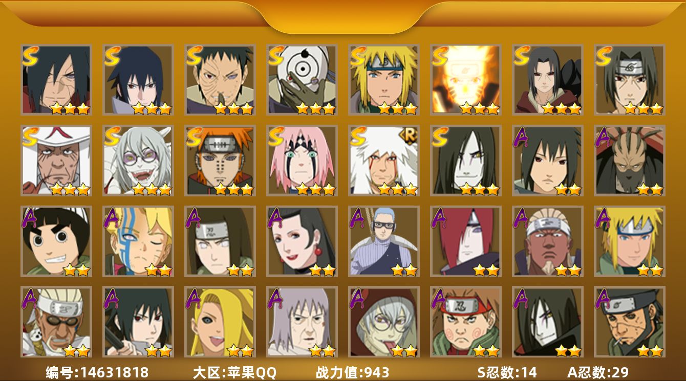[14631818]v3,14s,29a,943w战力,有四代黑土等热门a忍,卡卡西43片,yy1459 【s级忍者】:宇智波鼬「秽土转生」3星,宇智波斑「秽土转生·解」3星,春野樱「忍界大战」3星,宇智波带土「忍界大战」3星,宇智波鼬「须佐能乎」3星,自来也「舞之豪杰」3星,大蛇丸4星,猿飞日斩3星,波风水门3星,药师兜「仙人模式」3星,漩涡鸣人「九喇嘛连结」3星,佩恩「天道」3星,宇智波佐助「永恒万花筒」3星,宇智波斑 「白面具」3星宇智波斑「白面具」 【a级忍者】:艾「青年」2星,长门「青年」2星,波风水门「青年」2星,迪达拉「秽土转生」2星,大蛇丸「晓」2星,奇拉比「忍界大战」2星,飞段3星,飞段「死司凭血」2星,干柿鬼鲛5星,漩涡博人「桃式显现」2星,漩涡鸣人「仙人模式」2星,迈特凯5星,我爱罗「疾风传」3星,蝎4星,蝎「绯流琥」2星,猿飞阿斯玛5星,猿飞阿斯玛「秽土转生」2星,宇智波鼬2星,宇智波佐助「须佐能乎」2星,药师兜「半蛇斗篷」2星,照美冥「五代目水影」2星,日向宁次「忍界大战」2星,长十郎「六代目水影」2星,李洛克「忍界大战」2星,黑土「博人传」2星,秋道丁次「忍界大战」2星,千代「近松十人卫」2星,不缘2星,宇智波泉奈2星 【永久主场景】:木叶周年庆