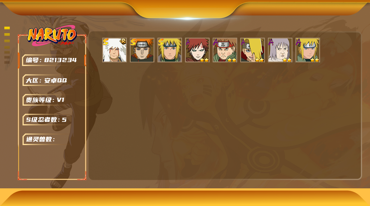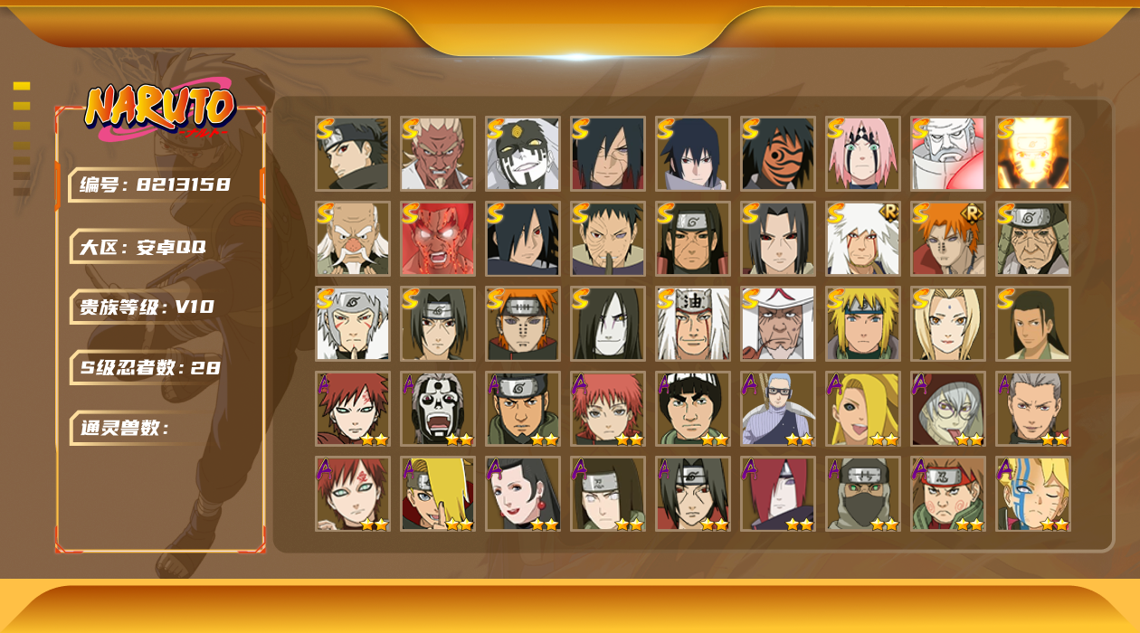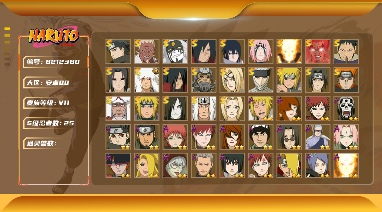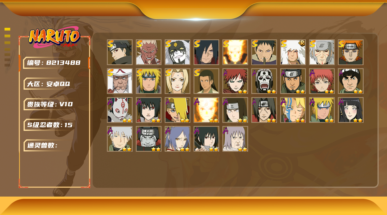 [8213488]xr36921-安q-可修改 贵族等级: v10 s忍数: 15 a忍数: 22 战力值万: 987 s级忍者: 千手扉间「秽土转生」佩恩「天道」波风水门纲手猿飞日斩宇智波带土 「忍界大战」自来也 「舞之豪杰」“宇智波斑” 「白面具」漩涡鸣人 「九喇嘛连结」千手柱间·木叶创立宇智波斑「秽土转生·解」大筒木桃式艾「忍界大战」宇智波止水「须佐能乎」旗木卡卡西「须佐能乎」 通灵兽: 忍犬忍龟蛤蟆吉蓝蛇猿魔蛞蝓蛤蟆仙人镰鼬山椒鱼蜃鲛鲨蛤蟆健乌鸦蛤蟆龙熊猫蛤蟆广万蛇砂之守鹤