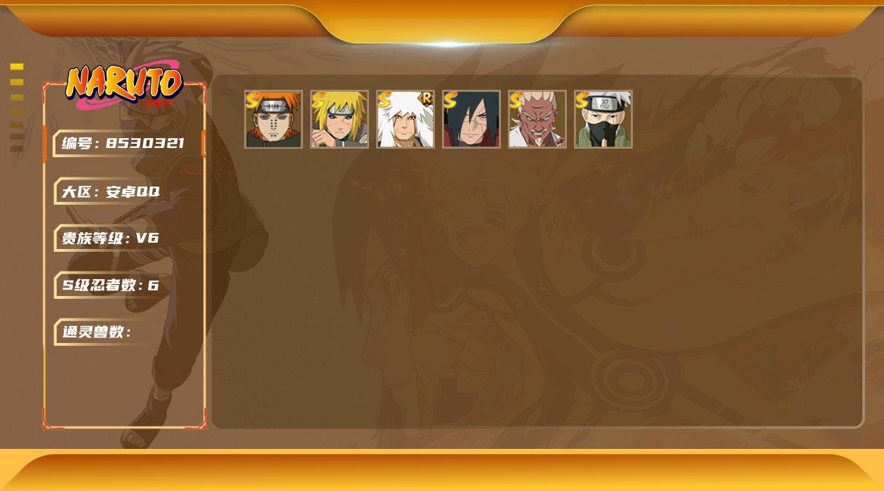 [8530321]v6 6s忍 470.1w战力 可二次 s级忍者:艾「忍界大战」宇智波斑「秽土转生·解」自来也 「舞之豪杰」旗木卡卡西「须佐能乎」波风水门「秽土转生」佩恩「天道」