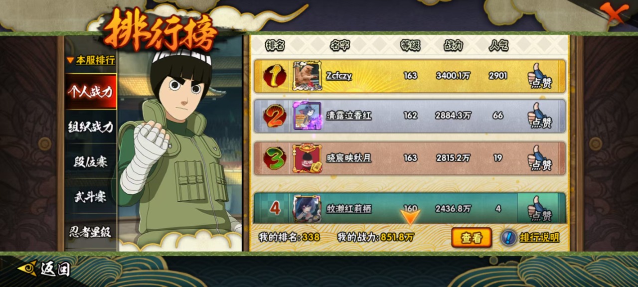 [8529384]v9 11s忍 668.7w战力 可二次 s级忍者:宇智波斑「秽土转生·解」宇智波佐助「永恒万花筒」漩涡鸣人 「九喇嘛连结」迈特凯「死门」宇智波带土 「忍界大战」千手柱间「秽土转生」药师兜「仙人模式」“宇智波斑” 「白面具」佩恩「天道」波风水门大蛇丸